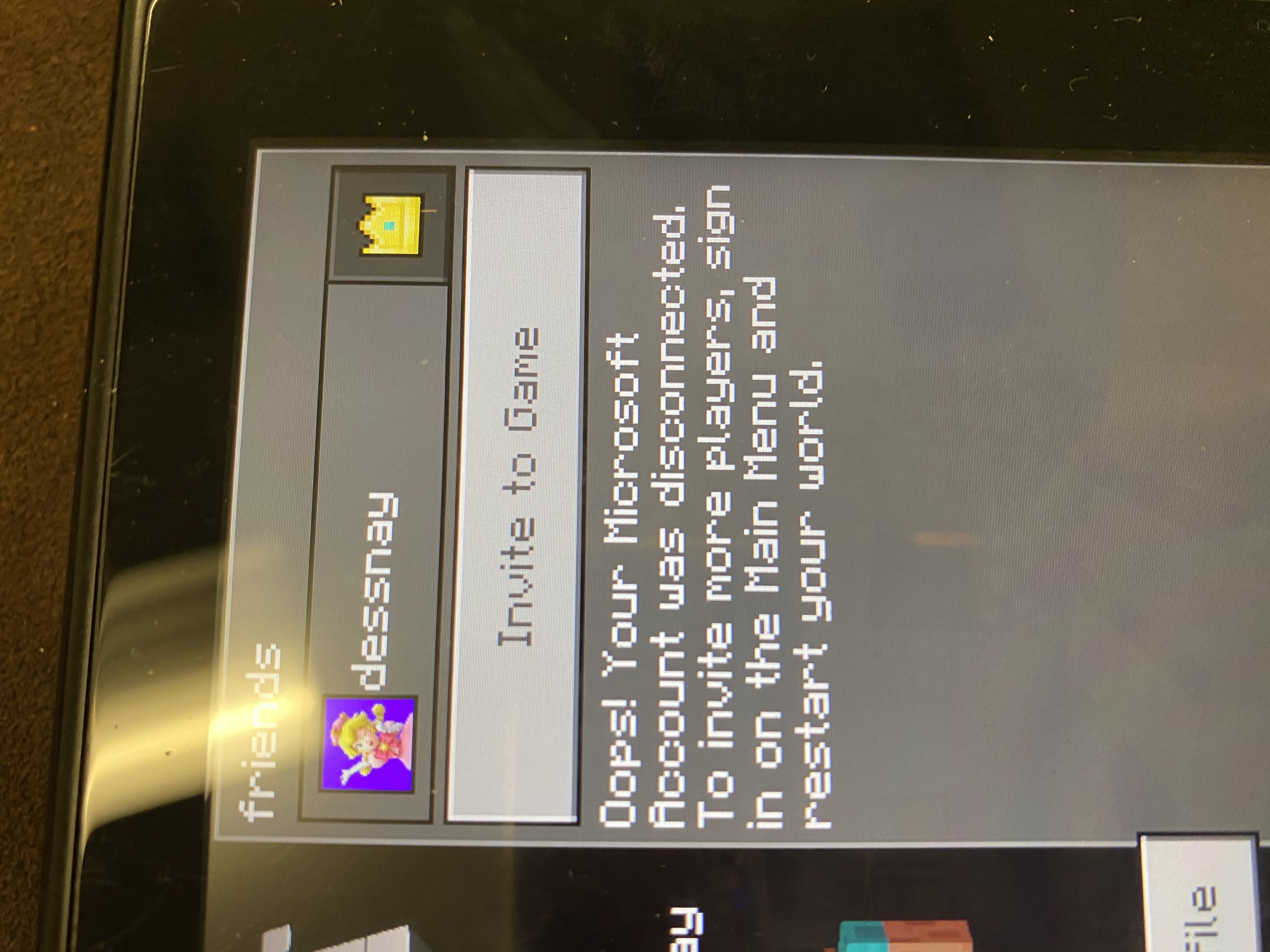 After updating Minecraft to 1.16.20, when you try to host a multiplayer game on Nintendo Switch, your friends can't join your world. It says "Oops! Your Microsoft account was disconnected. To invite more players, sign in on the Main Menu and restart your world.", despite being signed in on the main menu. However, you can still join your friends! They just can't join you.