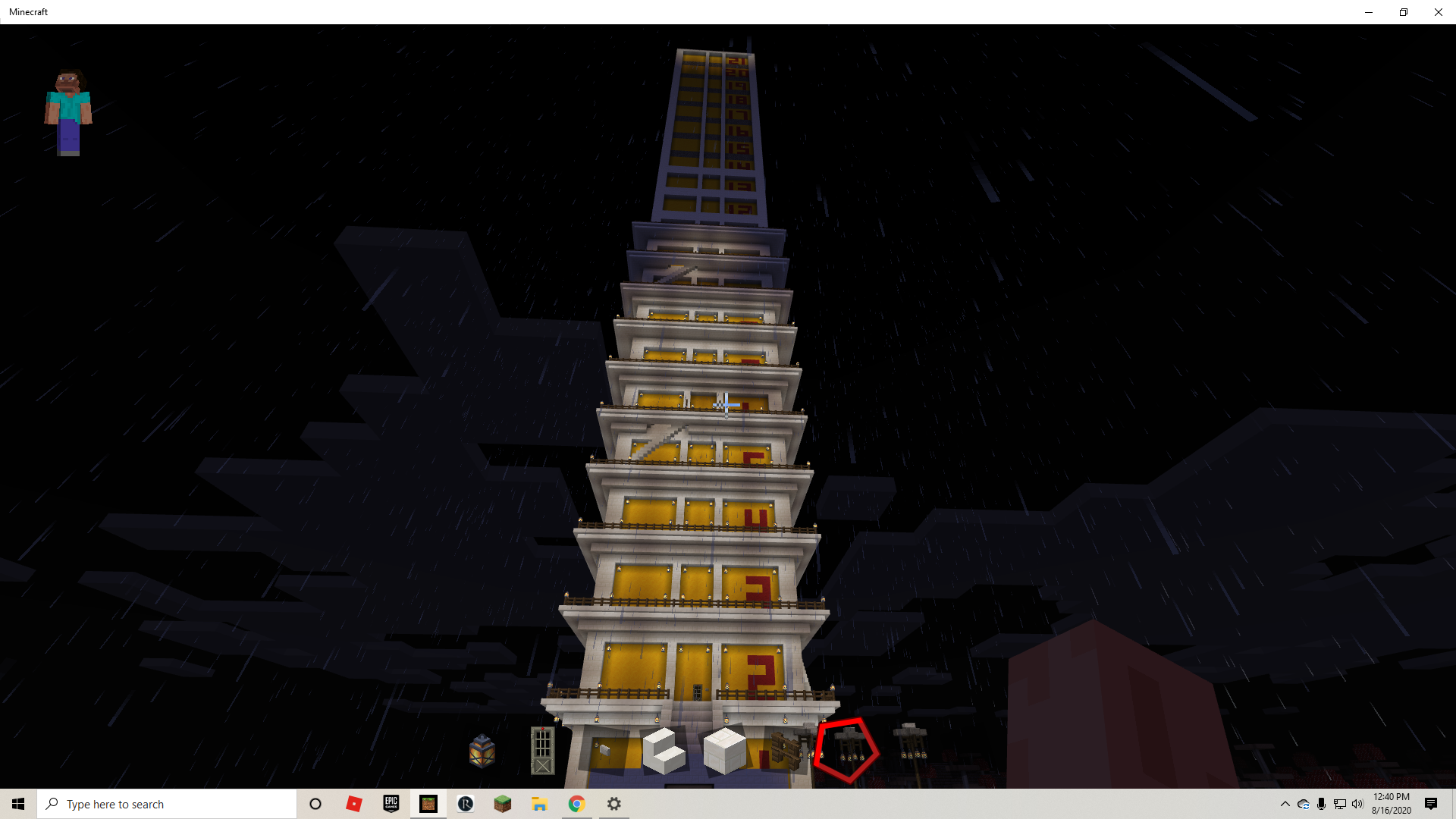 while i play on creation mode.. and i make a tall tower.. and ever time there rain.. and go thourh the building it really weird to see rain go though the building .. all way down the floors here a photo what i see. and my unfinished tower at night cycle.. and rain weather.. and when i go inside and i see rain inside?! weird!!!