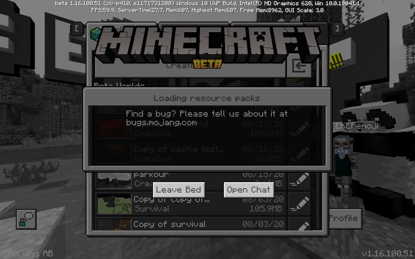 when entering my world i would appear in a bed, but the rest of the screen was black. if i clicked open chat or leave bed it would return to the MC home screen but parts of the previous screen was still there