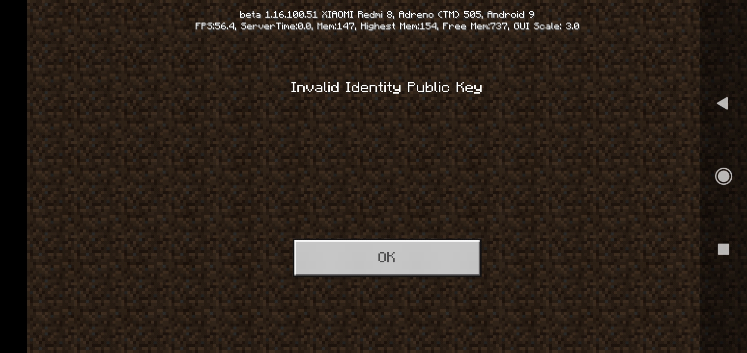 Recently. After the new update, everytime i want to log in to a server in minecraft. A Invalid Public Identity key error appears on the screen.