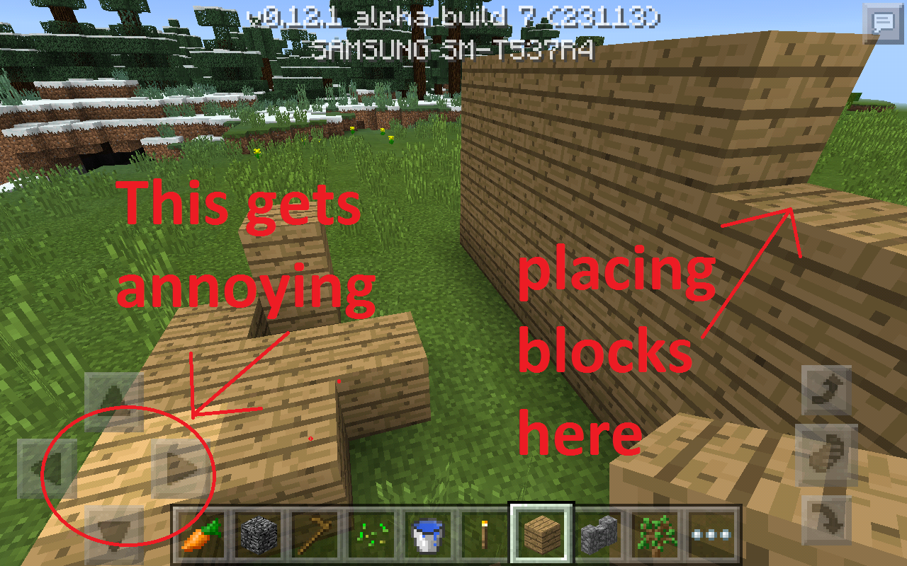 Confirmed bug in 0.12.1 build 7. I'm basically trying to build and accidentally press the center of the dpad and it places blocks on the ground. Very annoying! See photo.