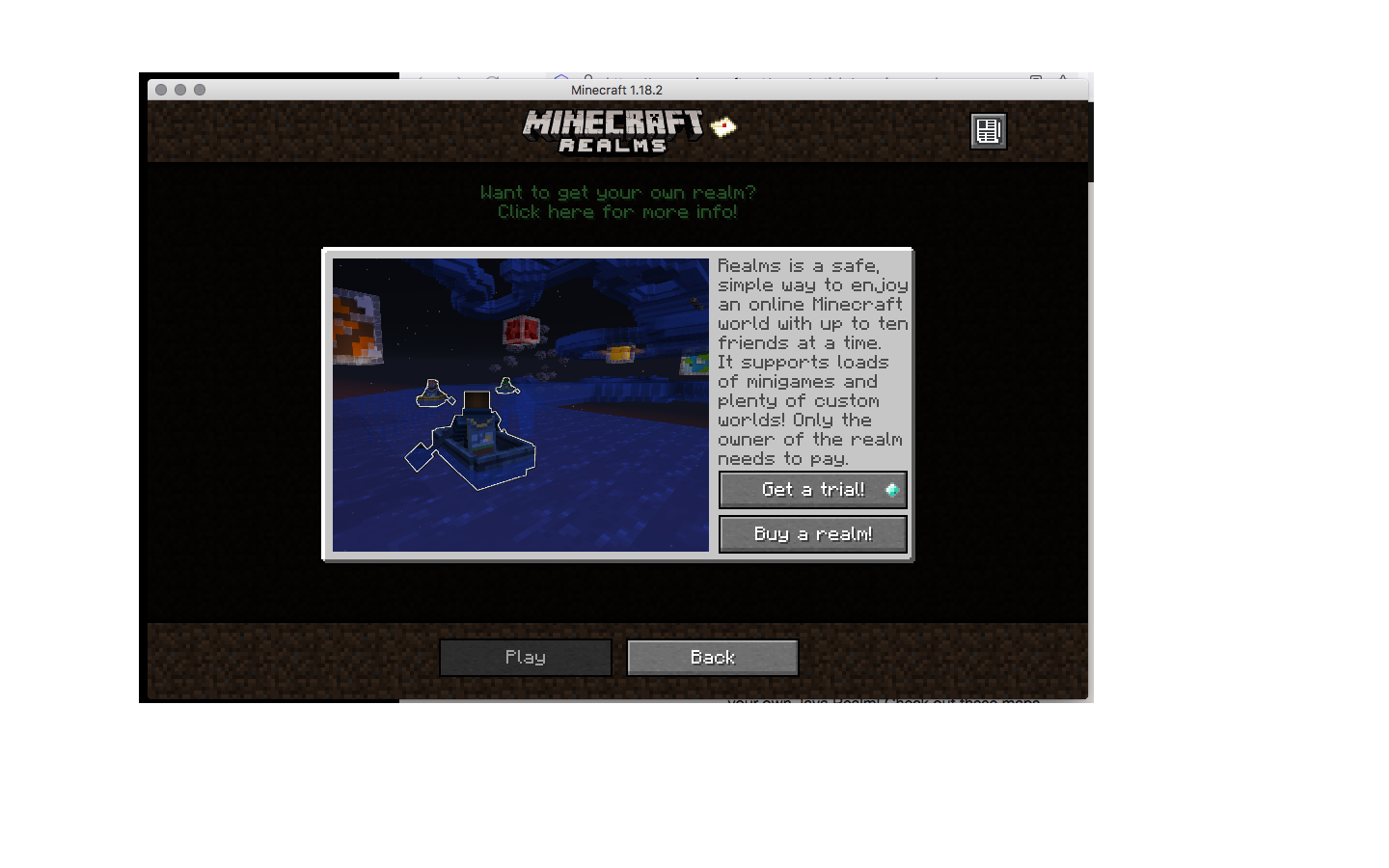 MC boots up normally through the launcher. Home screen has the blue diamond on the MC Realms button. "CLICK" MC Realms page shows an ad for either a Free Trial, Buy your own or both.