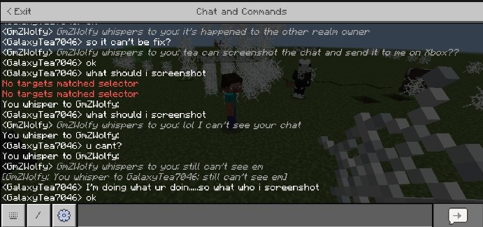 We could use the command '/w' to chat with each other but not the regular realm chat without using the command... The item such as nametag, book&quil, sign or the anvil couldn't be use or function as the way they should be.
