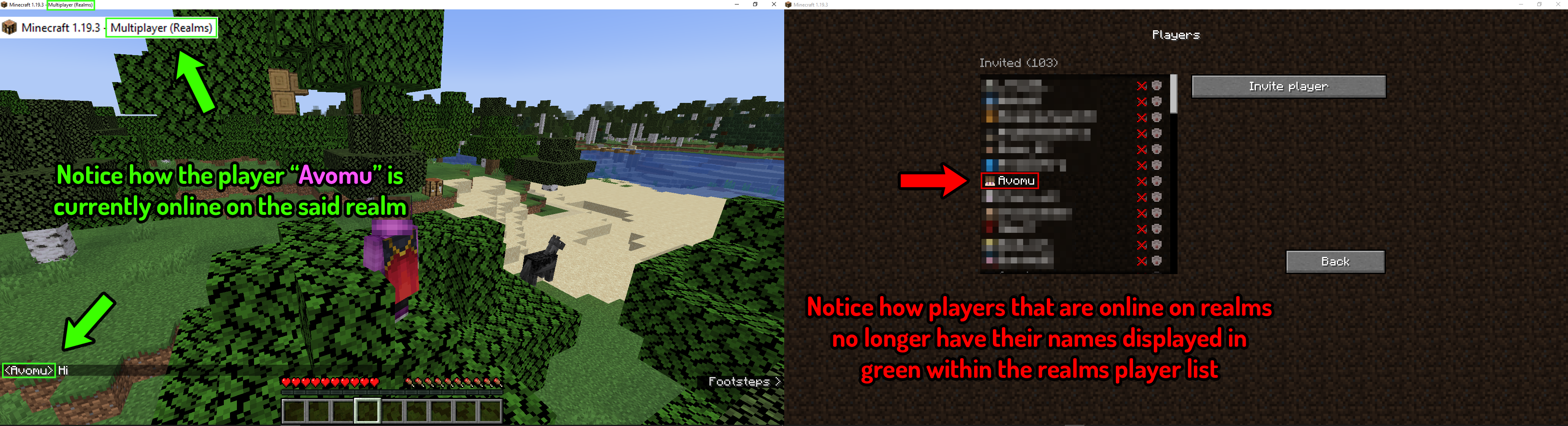 Take note as to whether or not players that are online on realms no longer have their names displayed in green within the realms player list.
