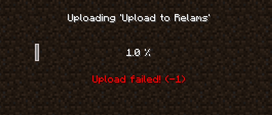 Whenever I attempt to upload a saved realm from a newer version of Java to a Java Realms, I get an Upload Failed! (-1). I've tried a number of saves (1.19.4 and 1.20.1). Same results. Older saves upload without issue (1.19.3 and earlier are all fine). Local and LAN versions of the save that fails to upload to realms work just fine.