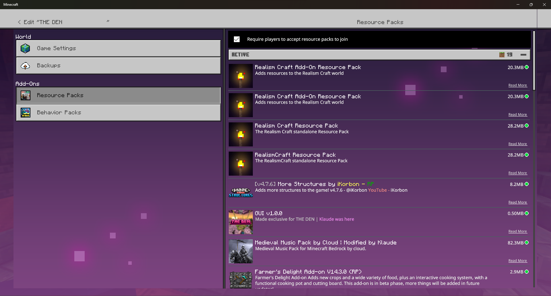 World template addons (such as RealismCraft) randomly stops working after the realm restarts. This happens way, way too often. Sometimes it fixes itself. Sometimes it doesn't. I've tried disabling and re-enabling the addons, sometimes it fixes the issue, sometimes it doesn't. I've even tried to download the world backup, re-enable the addons, and re-uploaded it. Still the same issue, no matter what.