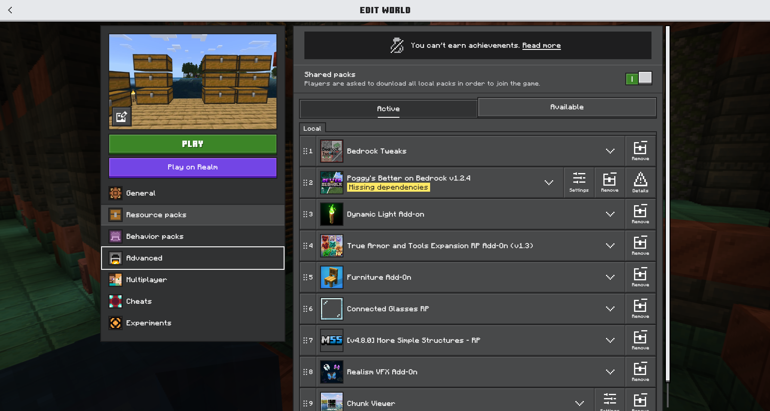 Everything goes well until I try to play through realms and it tells me to download extra mods that I need to apply to my world. However, I have ALL my current mods active and downloaded.