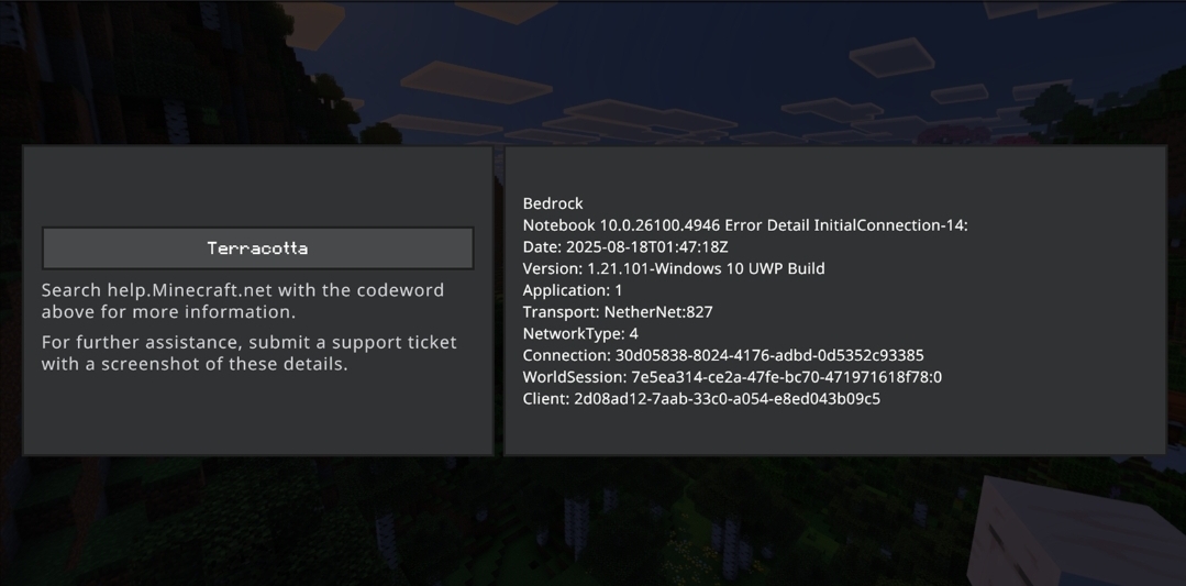 Yesterday, I was playing on a friend's realm, running throughout a nether fortress killing everything I came across, when we all got hit with a massive lag spike that didn’t go away. Soon after, the server crashed and I couldn't join. I stop playing for about 2 hours. When I return, my friends are playing just fine, but start lagging again when I try to join. And the lag lasts for about 2 to 5 minutes before the server crashes. I keep getting Terracotta as the error, but occasionally get Bat, Chest, and Nethernet. I have 91.4 gbs of free space. I don't see how Chest is a valid error. NetherNet and Bat are connection errors. And Terracotta tells me nothing, because the error is unspecified. Please help me fix this. The support ticket with Microsoft wasn't helpful, and I'd really like to play on the realm again.