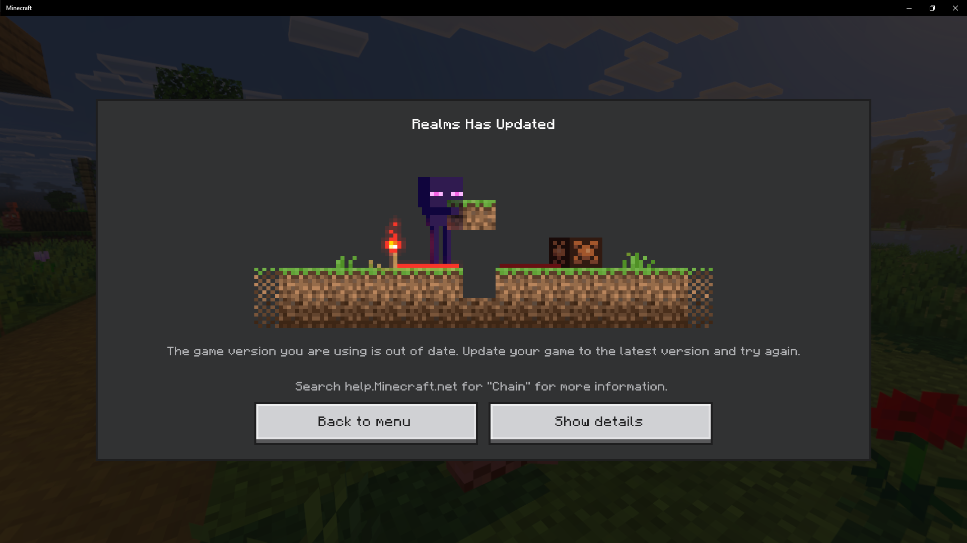 after attempts at joining any realms i get met with a screen that says my launcher is not up to date with a help link of help.minecraft.net and a code word of chains when i look that up on the link it doesn't exist many people are having the same issue on reddit it would appear Aswell as multiple friends of mine now that no one can access our realms I have uninstalled and reinstalled my game and launcher multiple times and logged out and logged back in to no avail