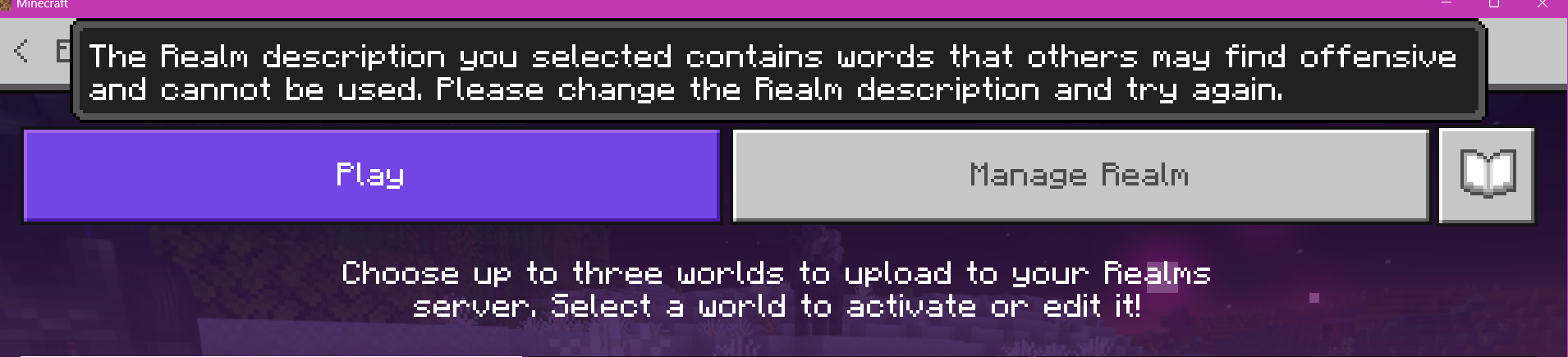 So, I’m the owner of the realm and right now, my cousins and I play together. I’m trying to change both the Realm Name and Realm Description but the pop up says I can’t use the words I used. This is the pop up word for word: “The Realm description you selected contains words that others may find offensive and cannot be used. Please change the realm description and try again.” The new Realm Name is “Cousins.” The new Realm Description is “Cousins survival and lore.” The new and old names and descriptions share the word “cousins,” which seems to be the word that is “offensive.” PLEASE FIX.