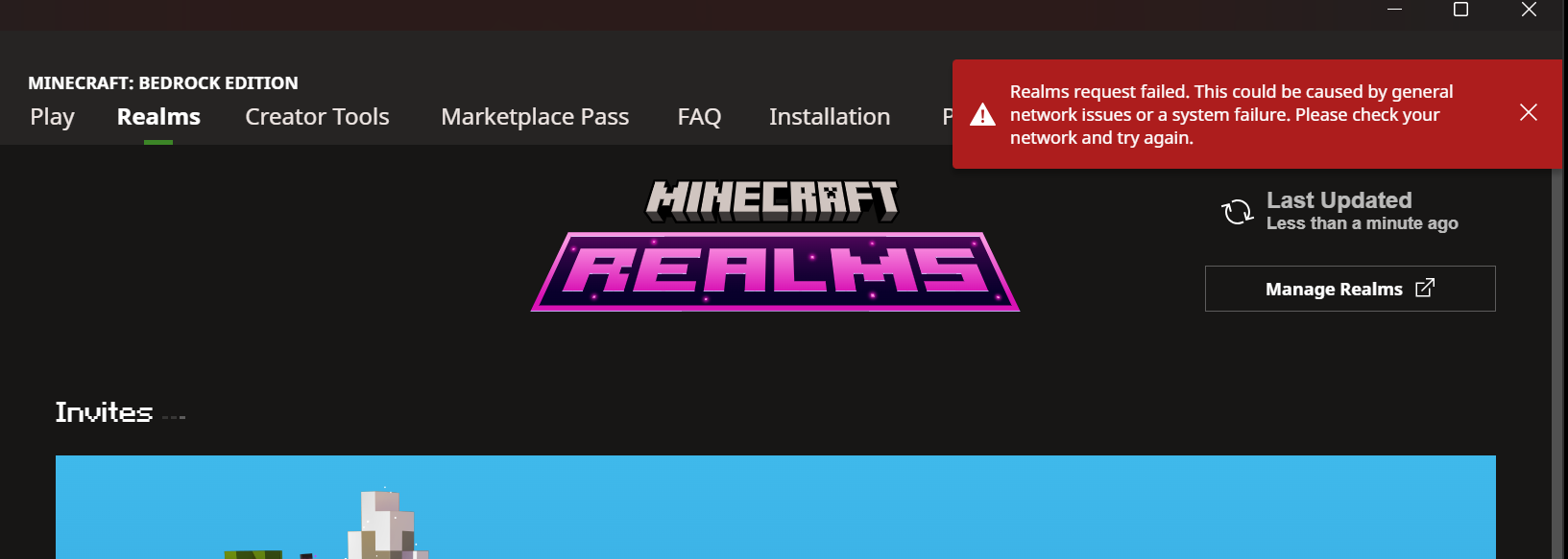 Owned Realms do Not show on realms tab, Failure to load. Notification pops up that there is a general network issue or system failure. Player side has no connectivity issue in terms of network. Believed to be system failure on launcher end. Please fix, thank you.