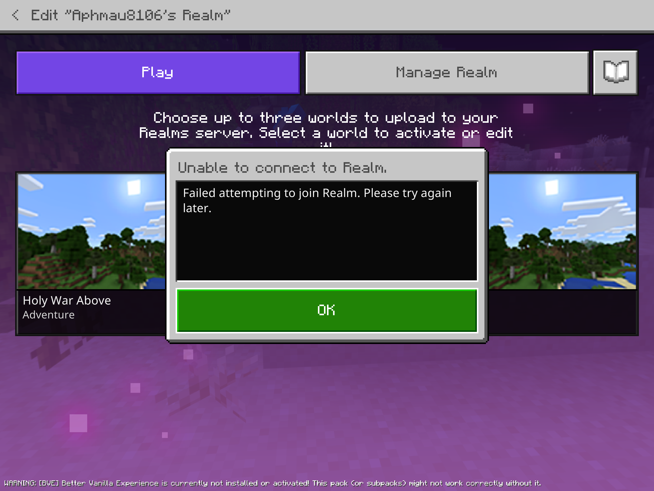 I was on realms, it kicked me out, then when I tried to re-enter the server, it says unable to connect to realms