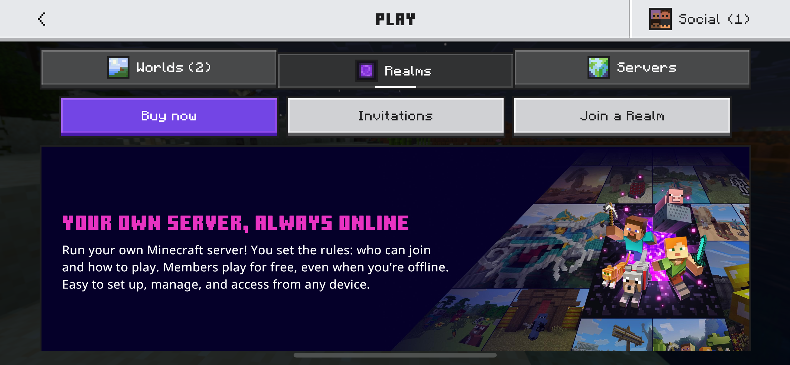 When I click the realms tab it just tells me to buy a realm, and the one I already bought won’t show up. We have also have had lag issues and gaps in our saves on our realm, where it’ll not automatically save for an hour or so.