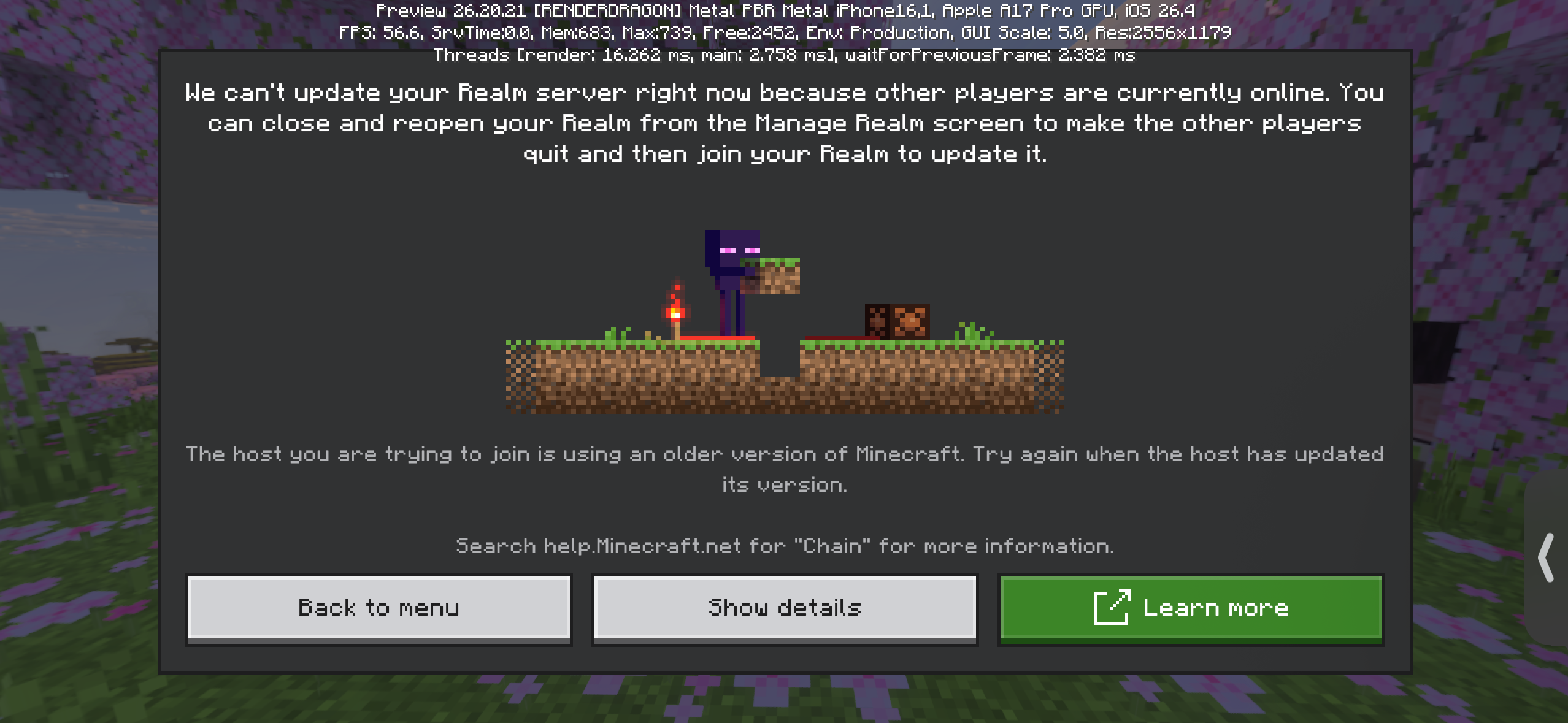 The realm i have for bedrock preview is saying that it cannot be updated to the newer version because others are still logged in. It then says I can have them sign out or try closing the realm to force them to disconnect, and try again. I did try closing the realm and then reopening it, but that did not help. Nobody is currently connected or logged into the realm. It seems to be a bug on the backend. This has been affected like this for over a week. Almost two weeks now. I am paying monthly for a realm but haven’t been able to use it for two weeks, I feel like I’m getting scammed. The only option I see forward is to cancel my subscription, and start up another subscription, manually downloading and uploading the world into the new one. The problem is, I don’t have a standalone realm subscription on the Preview side, because it’s a free realm coming from the paid one on the normal side. Meaning… I’d have to download those worlds, cancel the realm there, then start a new one, upload the worlds, go back to preview, hope I get the offer for the free realm on preview, upload the world again….. SUCH a hassle. Can we please fix this bug? It definitely seems like a bug on the realms side, thinking there is still someone logged in. I am using an Xbox series X, but I have also tried on the TestFlight version of Minecraft preview on iOS and iPadOS. I have also tried on Windows. My friends who are on the realm with me are using Xbox One and Xbox One S. None of us can log into the realm because we all have versions of Minecraft too new to where the realm server is updated to. (Auto updates on all of the Xbox and windows sides…..)