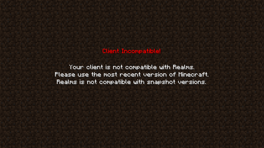 When trying to open Realms in a snapshot version, it's opening the "Incompatible Client" screen. However, that screen does not seem to contain a button that allows you to return to the main menu. You can only return there by pressing Esc.