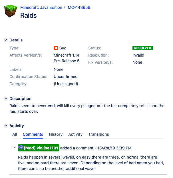 I killed a pillager with a banner and a normal pillager which gave me the bad omen effect. When I returned to my village a raid started. However, I have now played through what feels like 9 raids and every time the bar fills up again and more pillagers spawn. I have gone through 1 hour of playing and the raid never ends. I'm playing on normal difficulty on my 1.14 realm. The screenshot attached shows another report like this however the response in my opinion has not resolved the issue. I do not know what level of bad omen I had but I would like a response. Thank you. (UPDATE: I kept on fighting and they eventually stopped spawning)