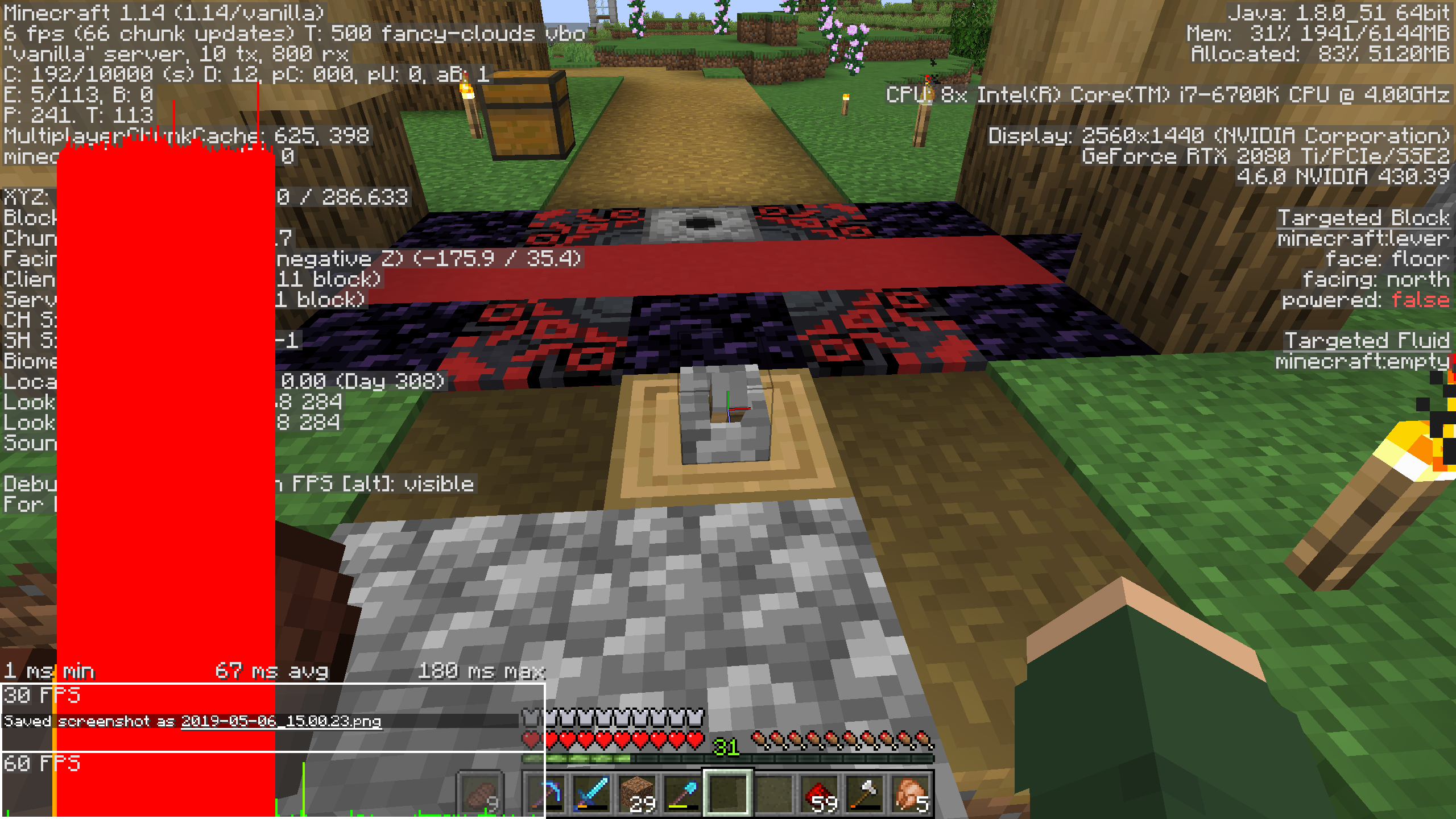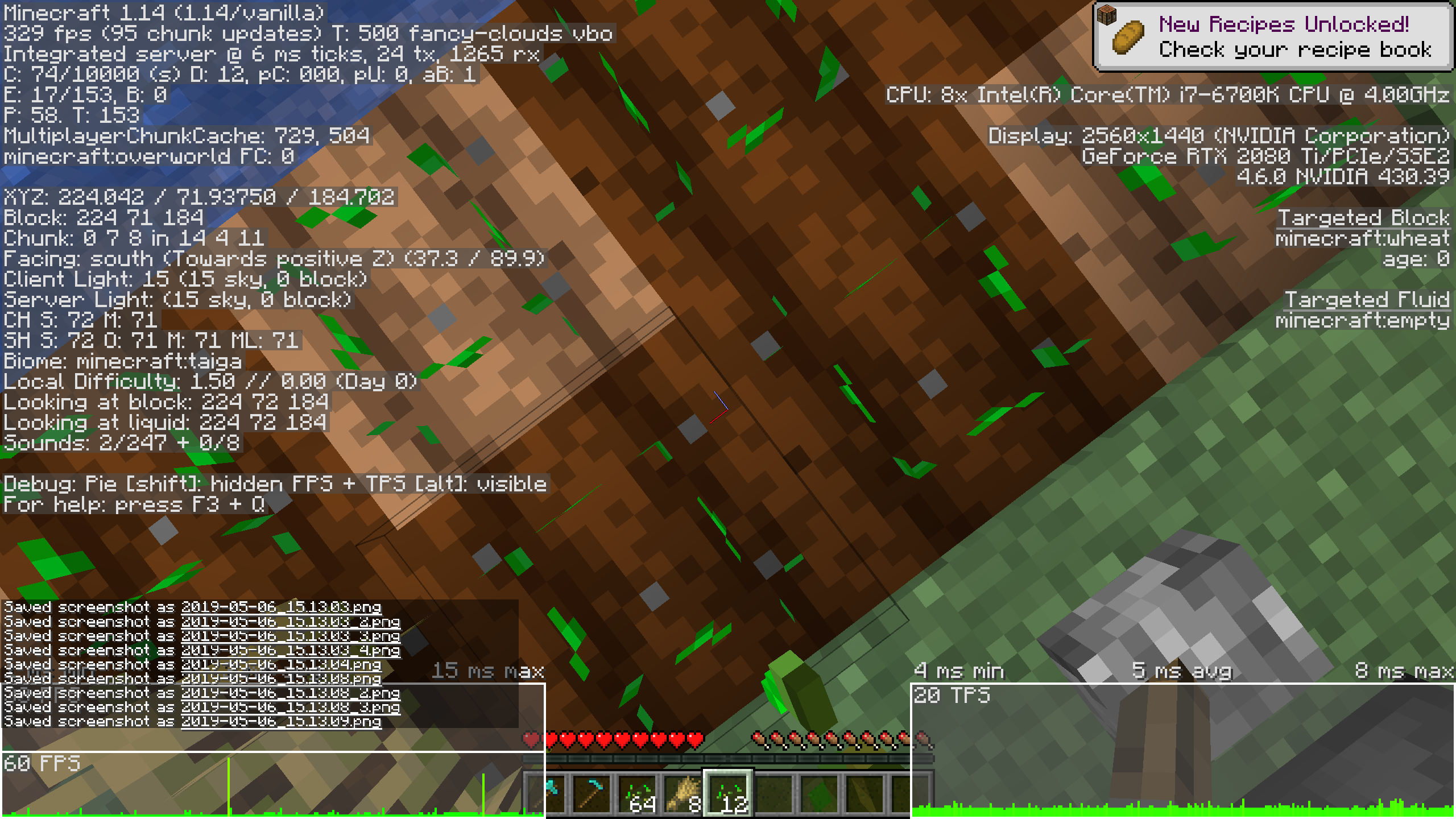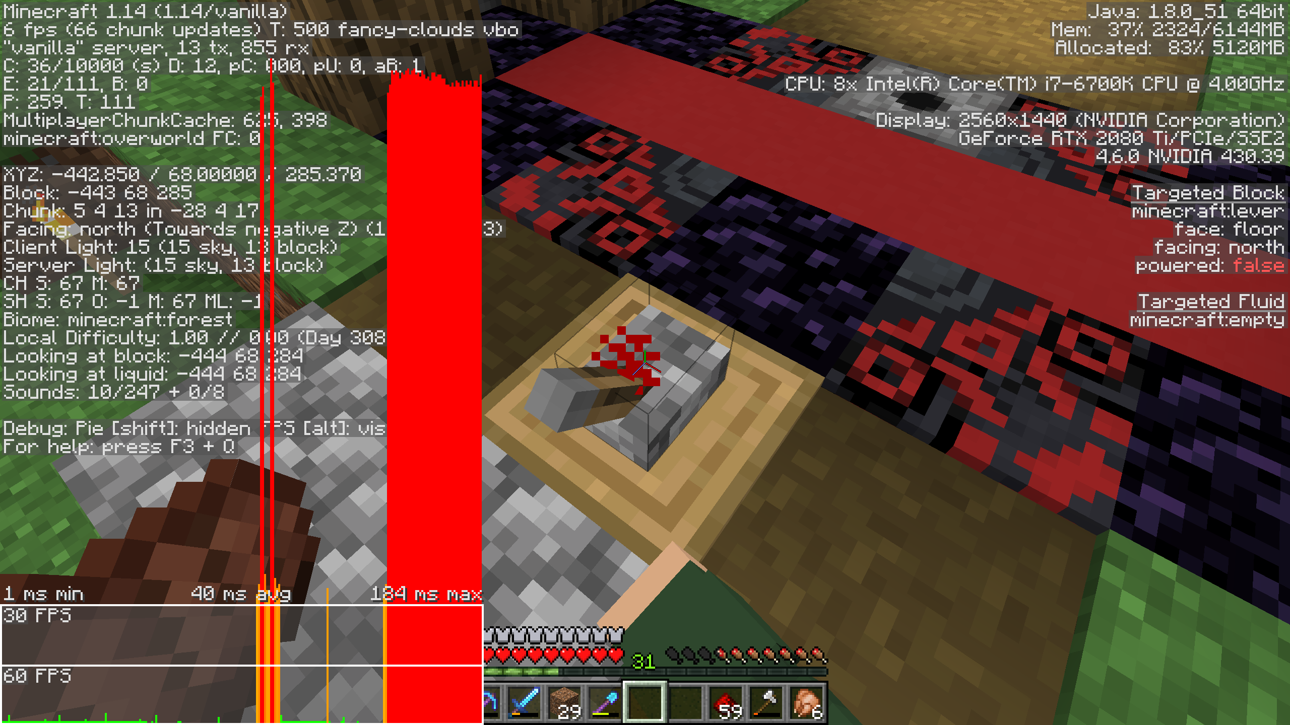 Many activities that cause blocks to update result in lag spikes, specifically in Realms. Culprits include but are not limited to: planting seeds, breaking wheat, fire spread, breaking logs that are touching leaves, and pistons (cause the worst lag). Taking part in any of these activities usually causes a brief but very sharp lag spike taking frames below 10 fps. Spamming the pistons causes the game to practically freeze. I tested this in SP and found none of the issues occur there... Only Realms