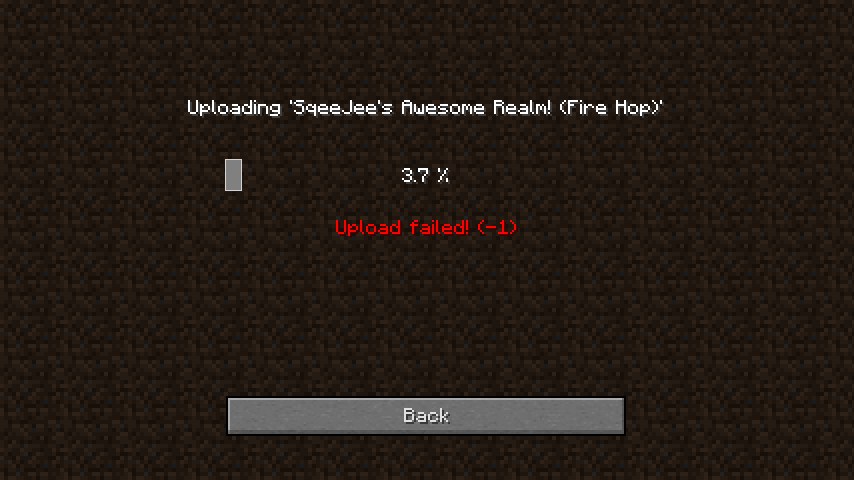 Trying to upload an old world that weighs about 0.8GB to our realms server, it's getting consistently stuck at around 5% or 6% when uploading (Error "-1"). This is really odd to me and I have just paid for the membership. I need help, we can't start another world because this one is very important.