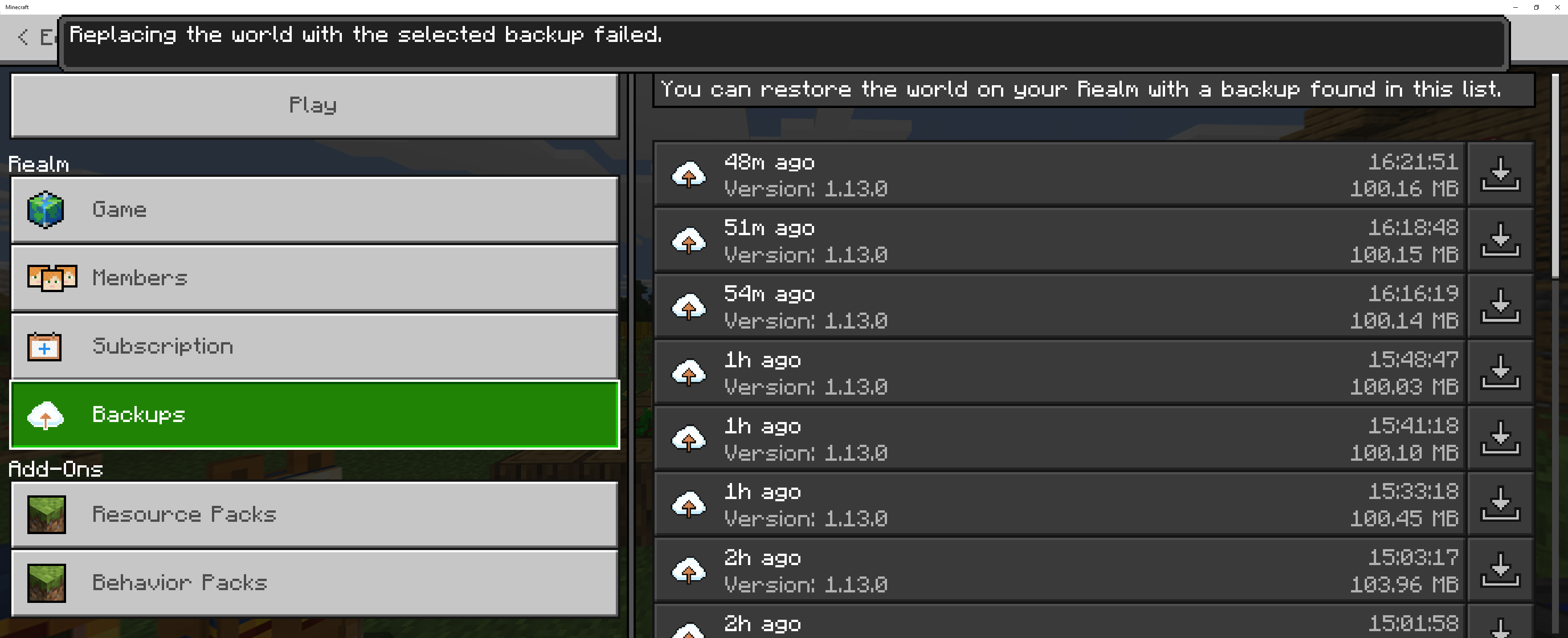 Playing Realms Bedrock on Windows 10, I am now unable to replace world in my realm. Since it initially wiped my realm to start the replacement, I tried restoring with a backup from the log and the backup failed to load as well.