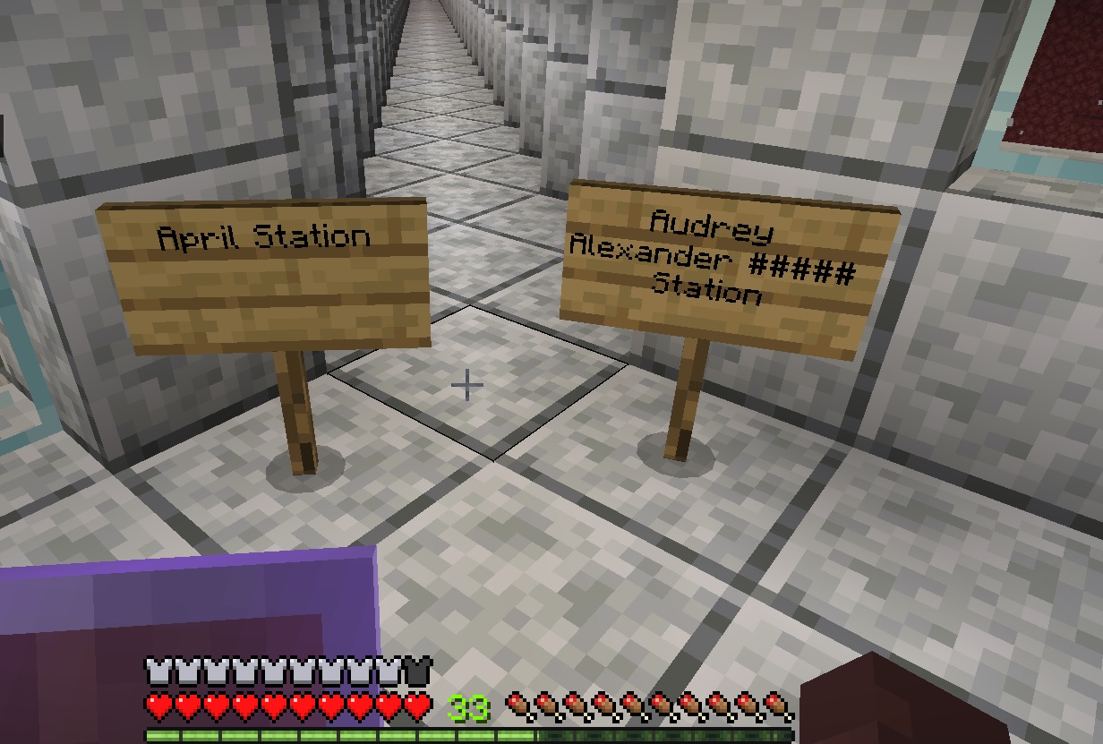 The line breaks and text formatting on signs is also still a major issue. I've had to resort to command block messages in order to get around really stupid sign filtering. Below is an example of what I put compared to what is actually put on the sign.