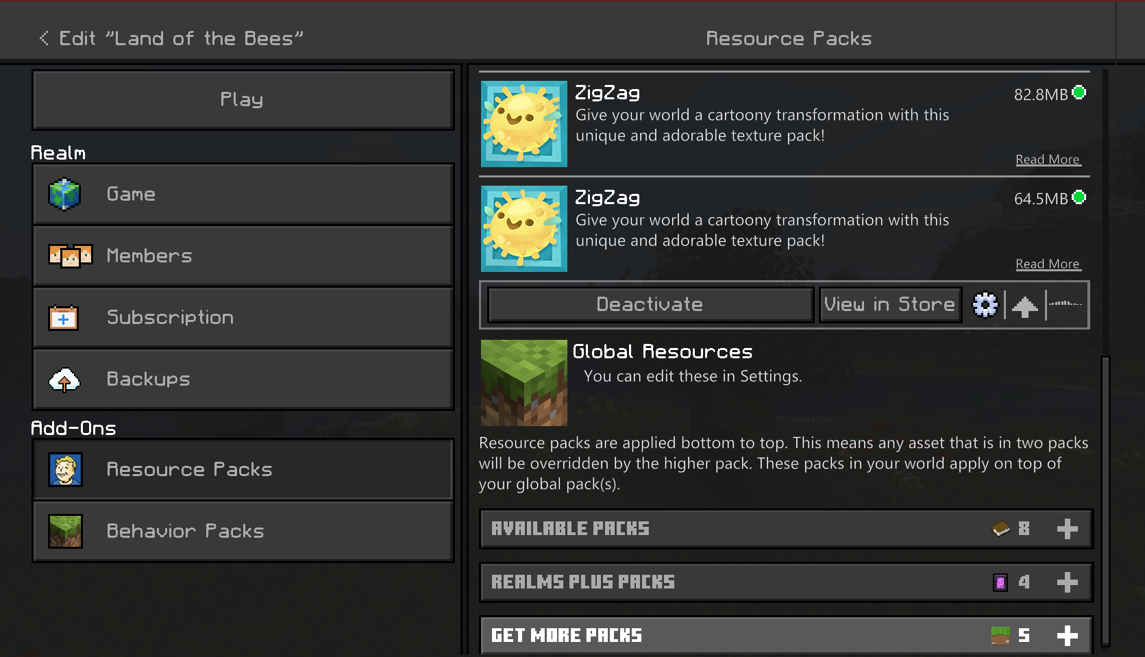 I have a realm and when I added Zig Zag to it and then connect it prompts me to download a resource pack (again). If I download, it downloads a seemingly previous version of it instead and then I have 2 copies of Zig Zag on the Realm, one being the most recent version freshly downloaded off the Marketplace and then one, I'm assuming is an older version, that is about 20 mb smaller.