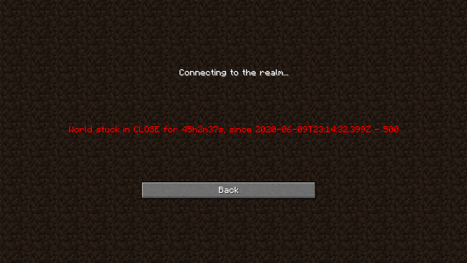 When pressing play on my realm, I get this message: '' World is stuck on CLOSE for 44h28m2s since 2020-6-09T23:14:32.399Z - 500''.