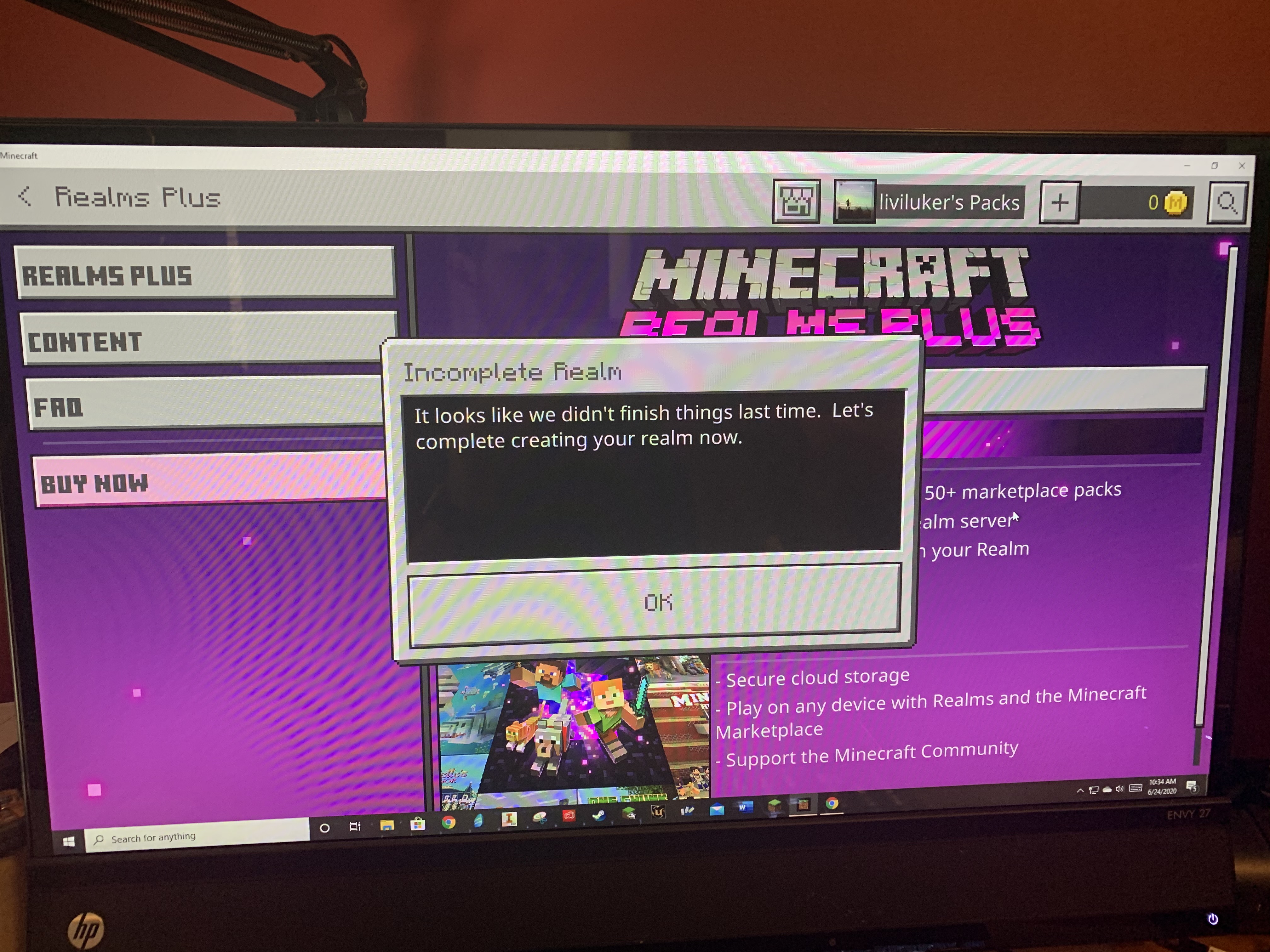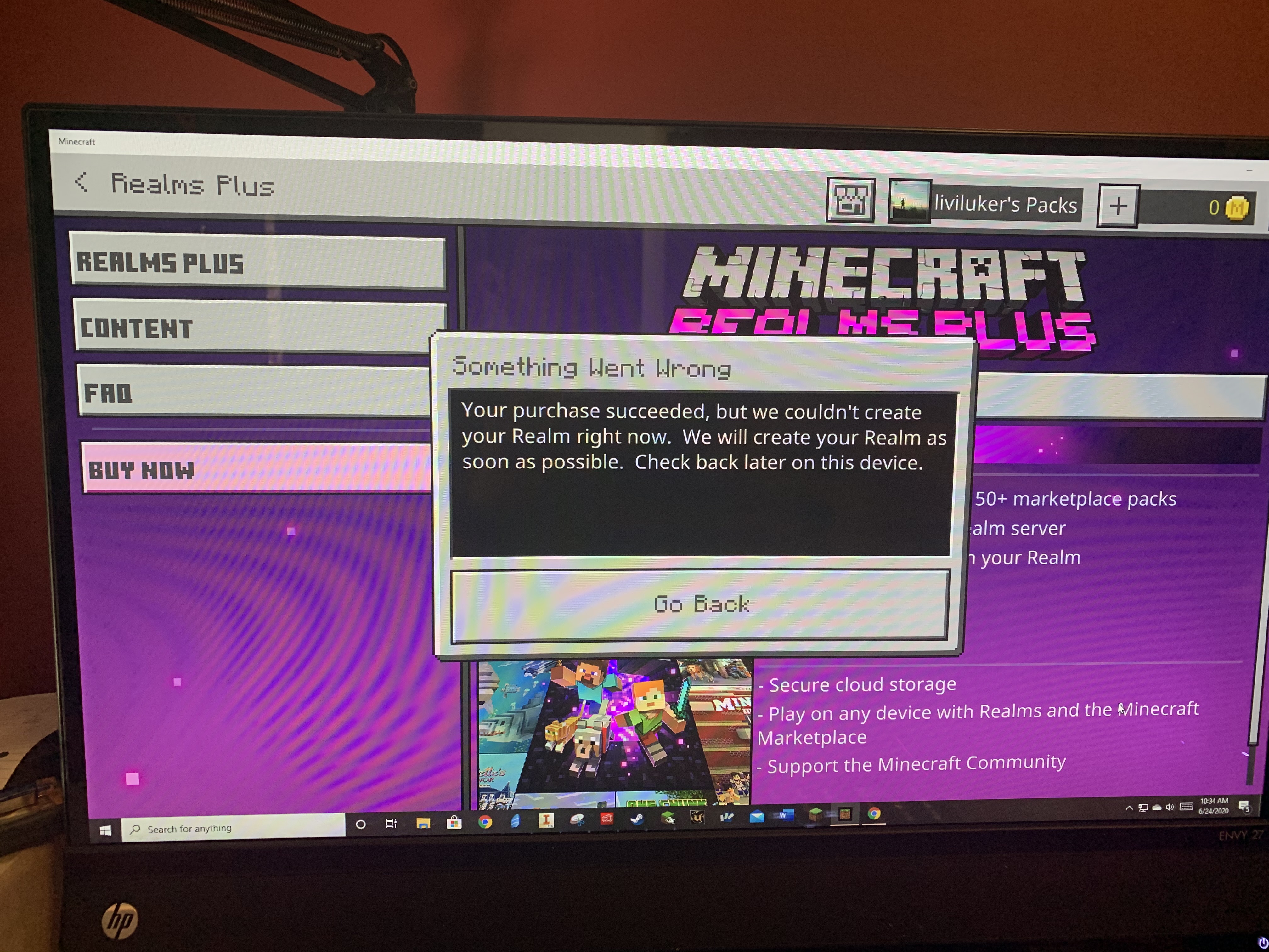 Once I select "OK" the next dialogue box pops up instantly titled "Something went wrong", the story of my life. The box says "Your purchase succeded, but we couldn't create your realm right now. We will create your realm as soon as possible. Check back later on this device."