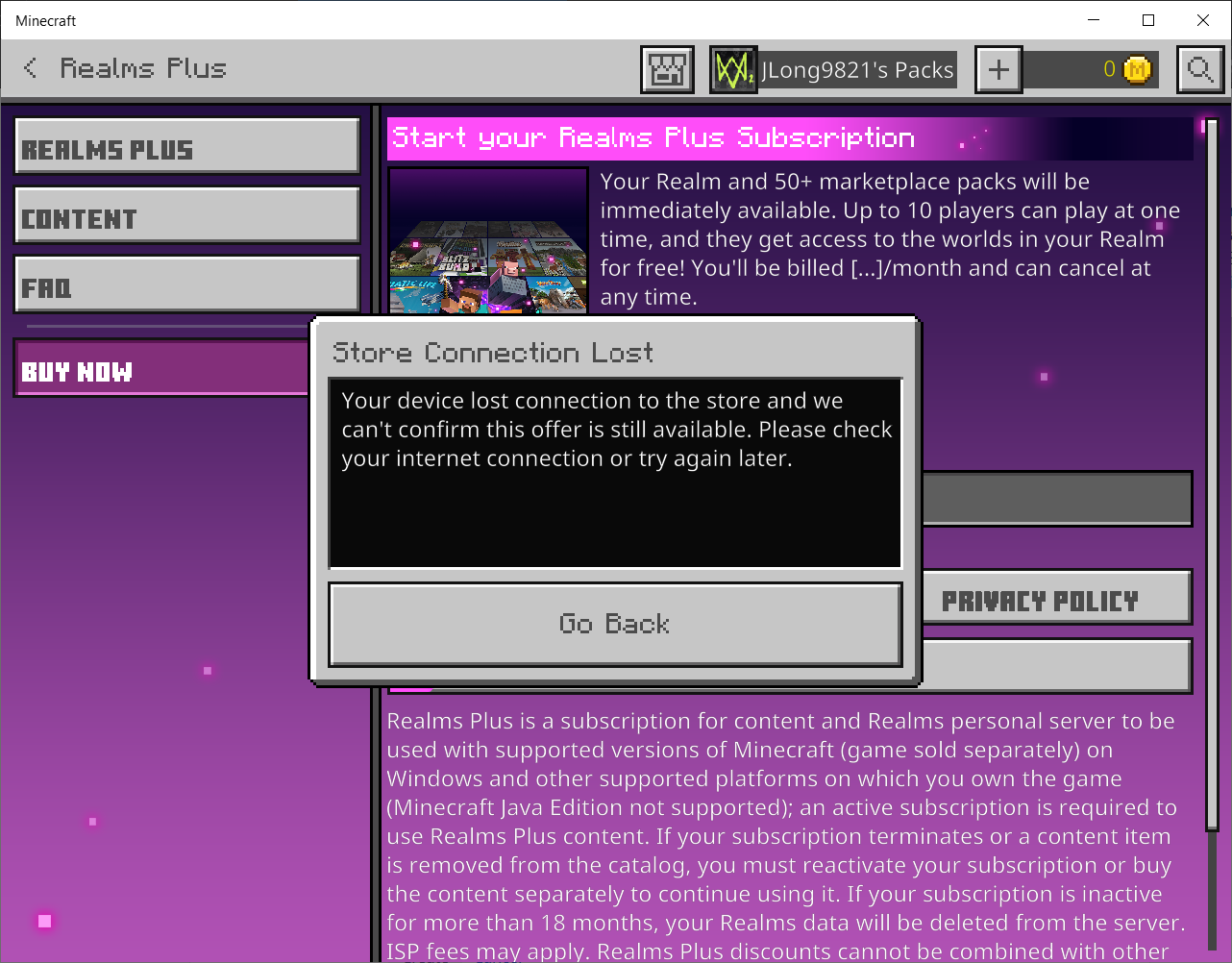 I am trying to purchase a Realm on Window 10 Bedrock edition of Minecraft. I am connected to internet and my account is active. I will supply a picture of what my game looks like when I try to purchase a Realm. In the description of trying to purchase, it does not give me a price it just shows [...] per month.