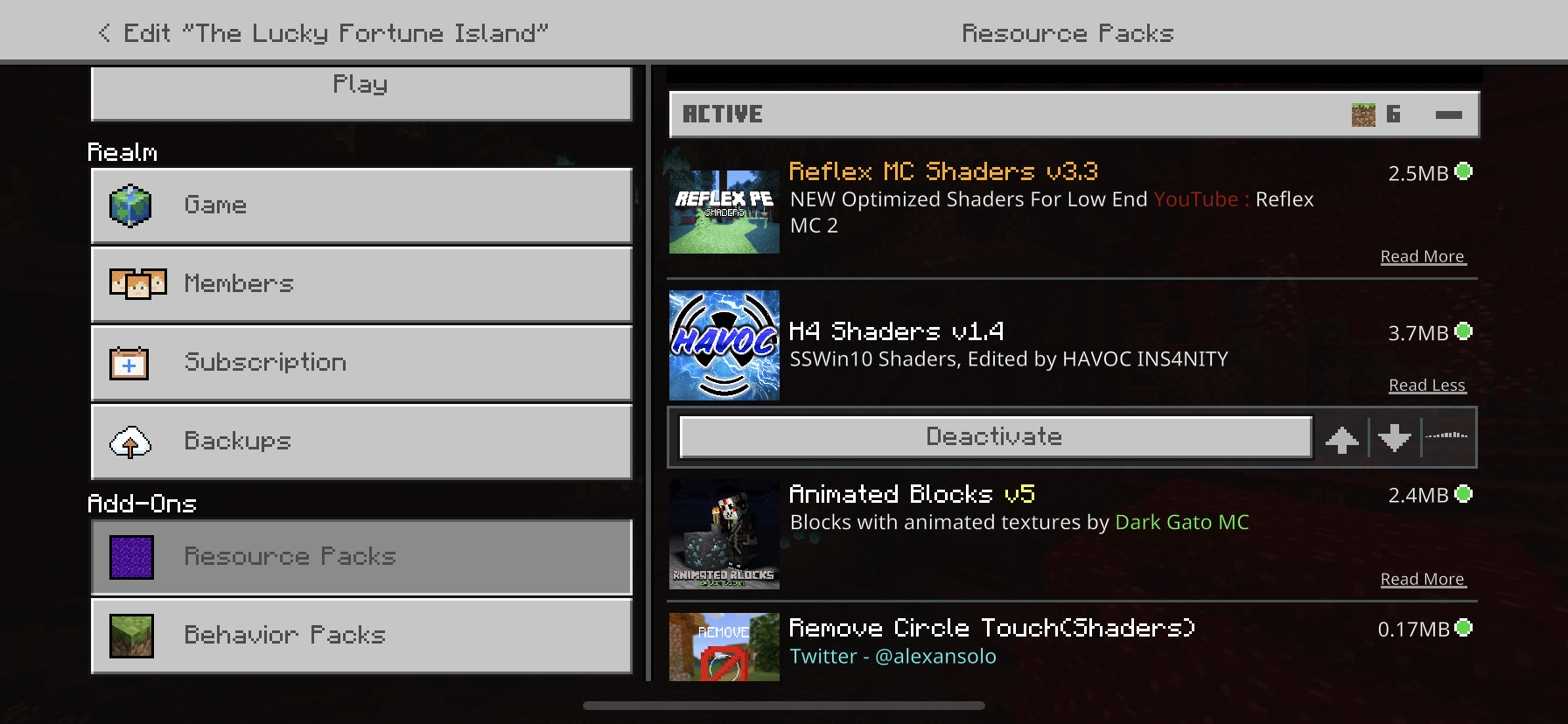 In my realm, I tried to add shaders and animated packs. In loading screen kinda weird to me like spam asking me to join download it. Then, It changed to purple and black checkers. I entered my world, it changed my buttons, health bar, chats, and etc. I never downloaded this pack, "H4 Shaders v14". This pack keep appearing random when I add shaders or mods. I tried to remove this pack, it is impossible to permanently delete forever.