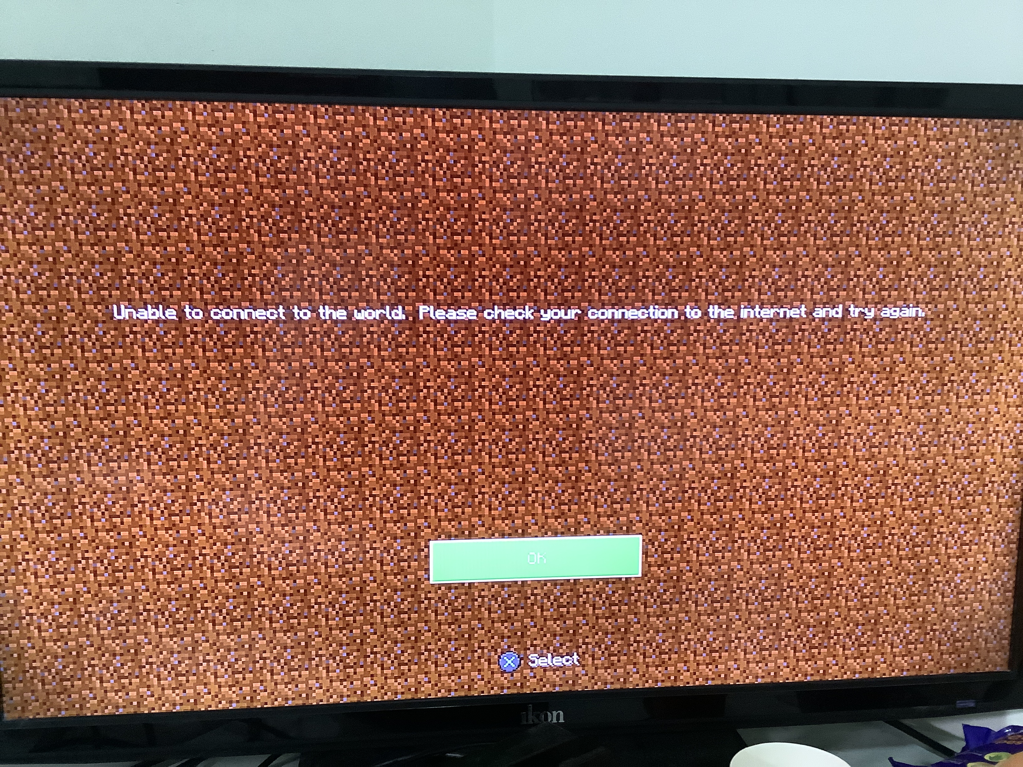 Error message 1 appears saying "Unable to connect to world. Please check your internet connection and try again." After a second or two, error message 1 disappears and is replaced by error message 2: "Unable to connect to world."
