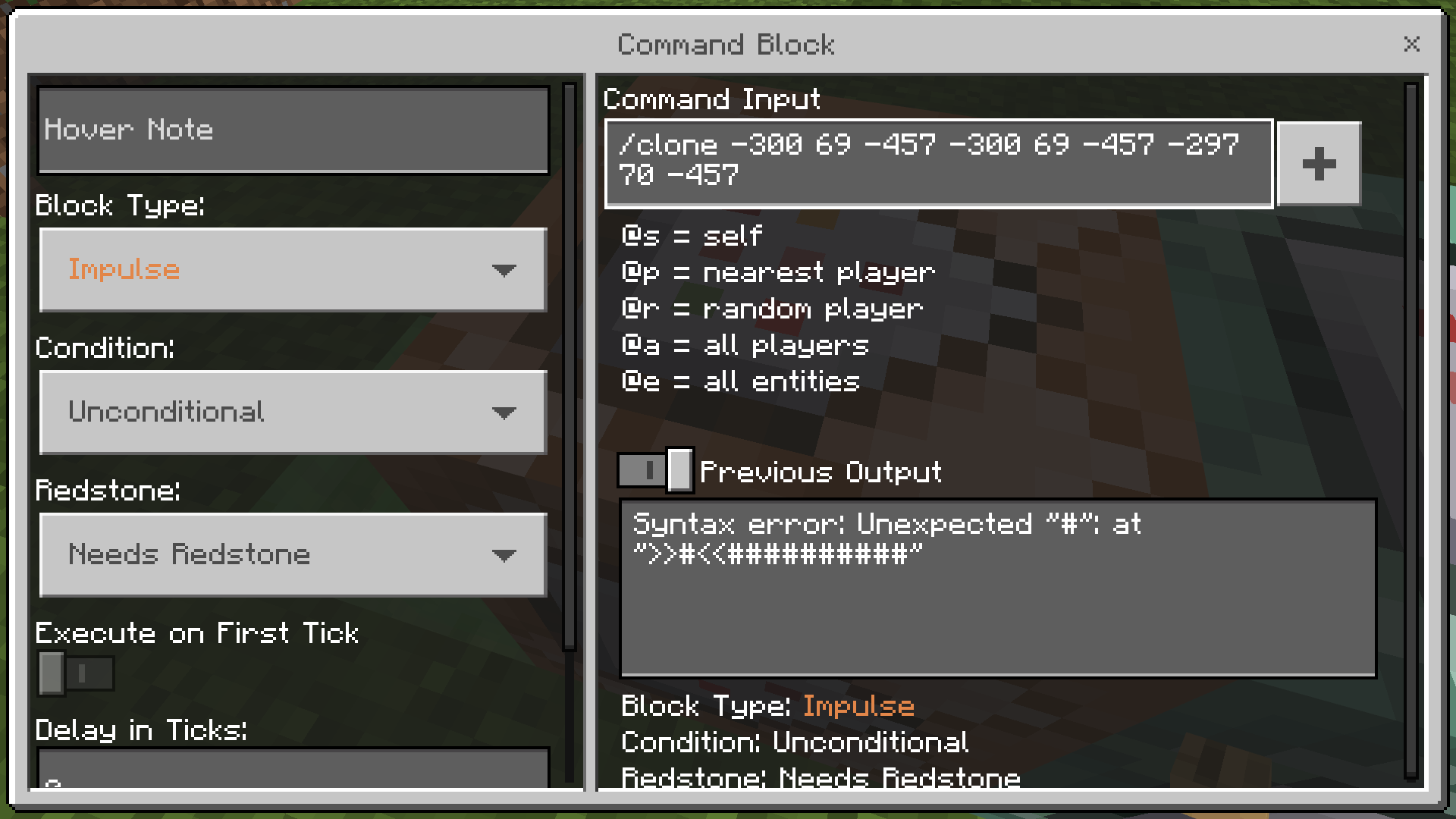 When I was doing the /fill command in a command block, it all turned into hashtags when I got to the second coordinates. It works fine in chat, and it works when you use tildes. I tried typing the numbers all in one go, but again I got the same result.