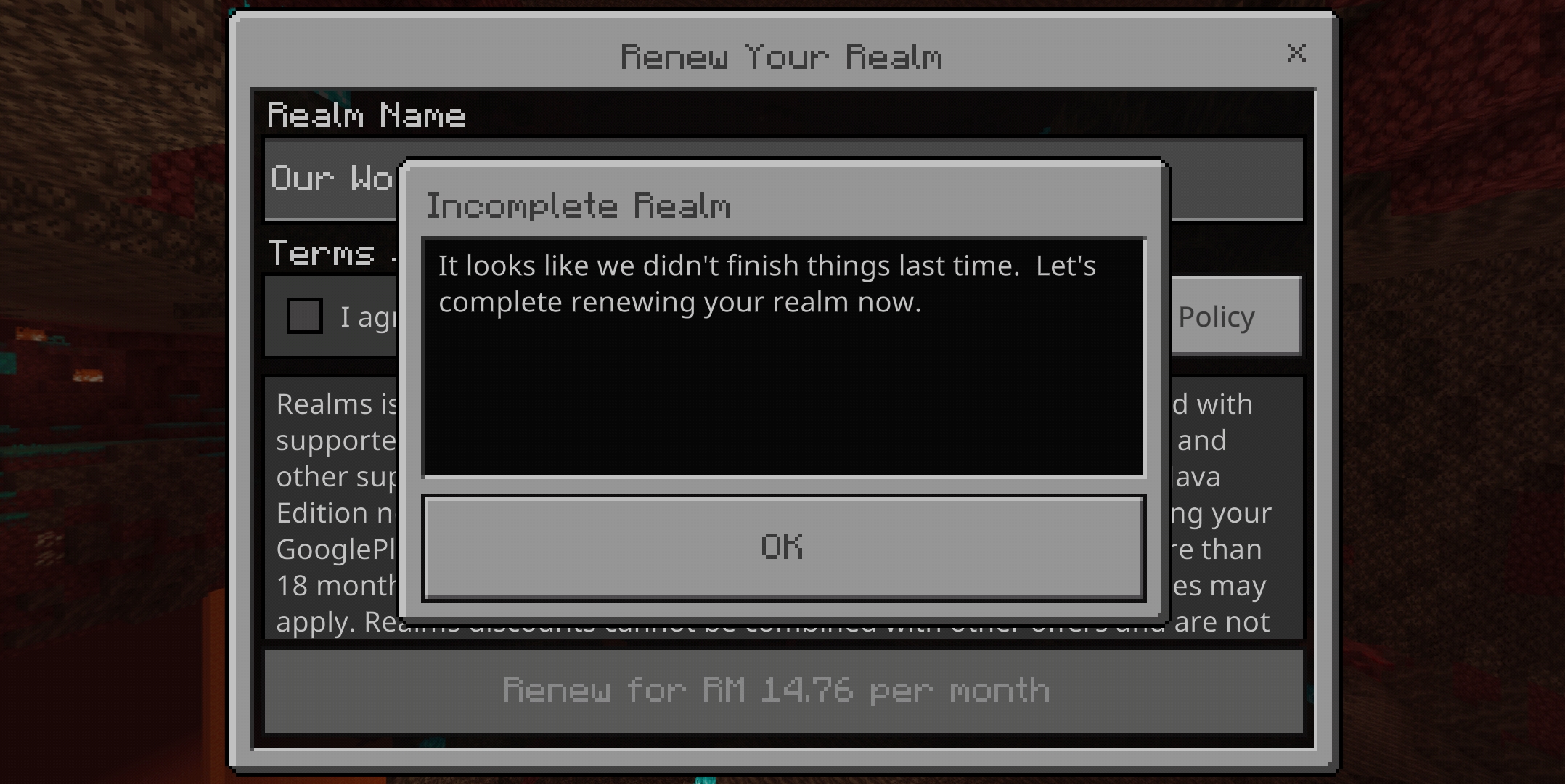 I recently renewed my Realm subscription with my Google Play account, and I encountered this message after the purchase. I'm not sure if this is a bug or Mojang is currently having an issue with the realm right now. I have heard many users are also experiencing this similar issues. Mojang, Please help me, I don't want to waste my money just like that