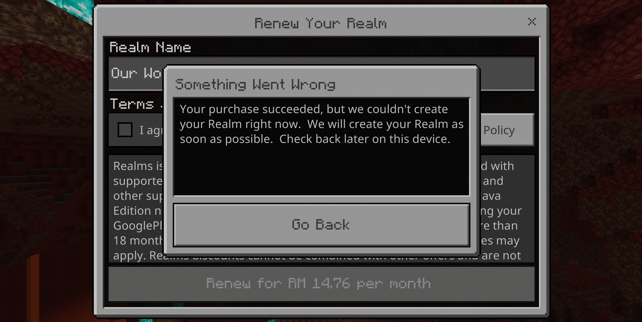 "Your purchase succeeded but we couldnt create your realm right now"