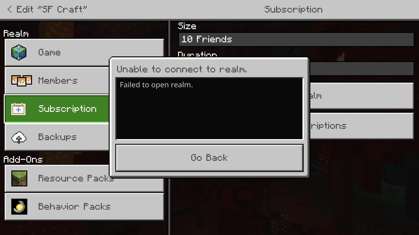 One of the images shows what happens when opening and closing. It says “Unable to join realm”, and “Failed to connect to realm”. When replacing the world, it freezes when it gets to “Initiating Upload”.