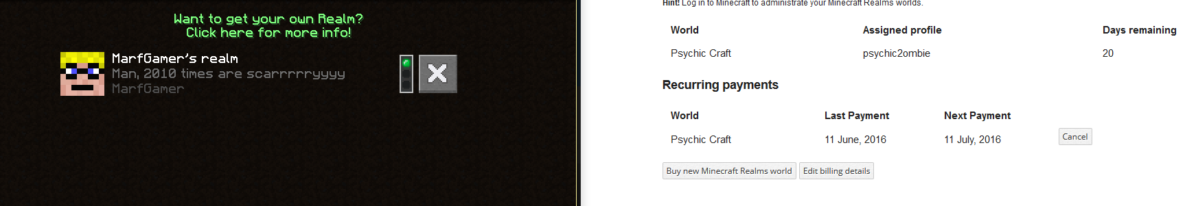 I have just opened Minecraft and it is asking me again. I have also uploaded a screenshot showing Minecraft asking me to buy a realm and my Mojang account that clearly shows that I am still paying for my realm. Also fixed affected version, it affects 1.10. Also MarfGamer is not me as you can see from the screenshot, my username is psychic2ombie and my realm is Psychic Craft as you can see by the screenshot of my Mojang account page.