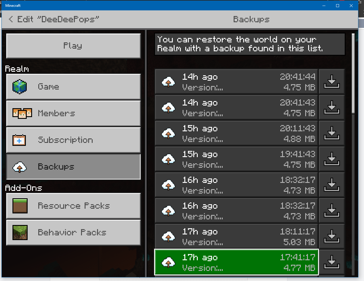 Windows 10. Up to date on OS patches. No issues until yesterday evening (4/14). I could not load my realm. Stated there was an error. So I tried to load a backup...every one I tried failed. I uninstalled Minecraft and reinstalled it. Same issue. I tried to download it as well...it failed on those too. It's the only realm I've ever built. GamerTag is The FuzzDad (Used to work for Valve a long time ago so names were weird). It's a normal realm called DeeDeePops on a 10-person subscription....maybe 20 hours effort so not that big (less than 5mb).