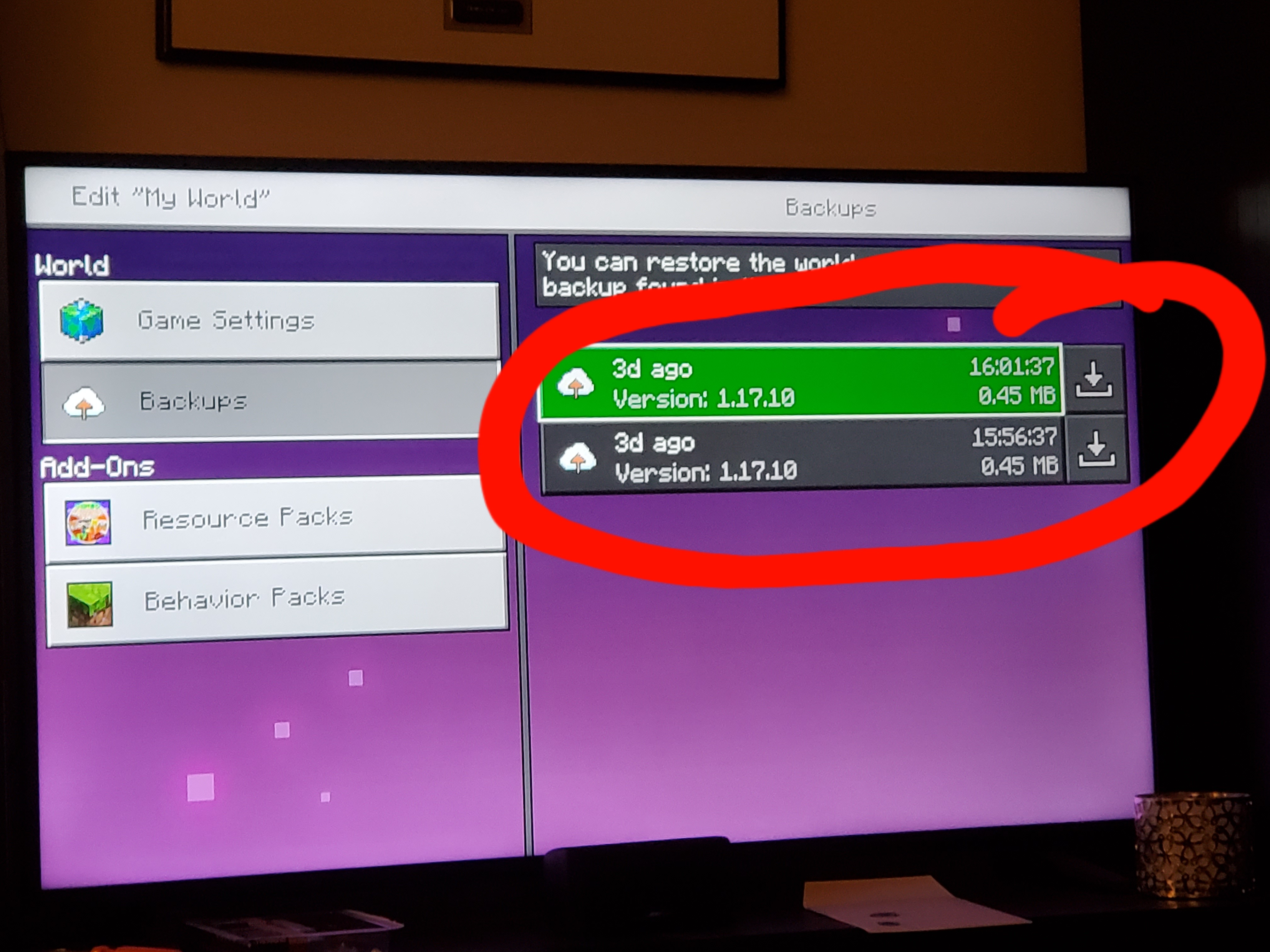 The World settings include the world name, difficulty level, game mode, and backups. From here you can also activate cheats, download or upload (replace) the world, reset the world, restore a backup world, and manage the world's add-ons. The World settings are accessed by clicking the pencil icon, choosing the picture button for the world you want to edit, and clicking the Edit World button that appears.