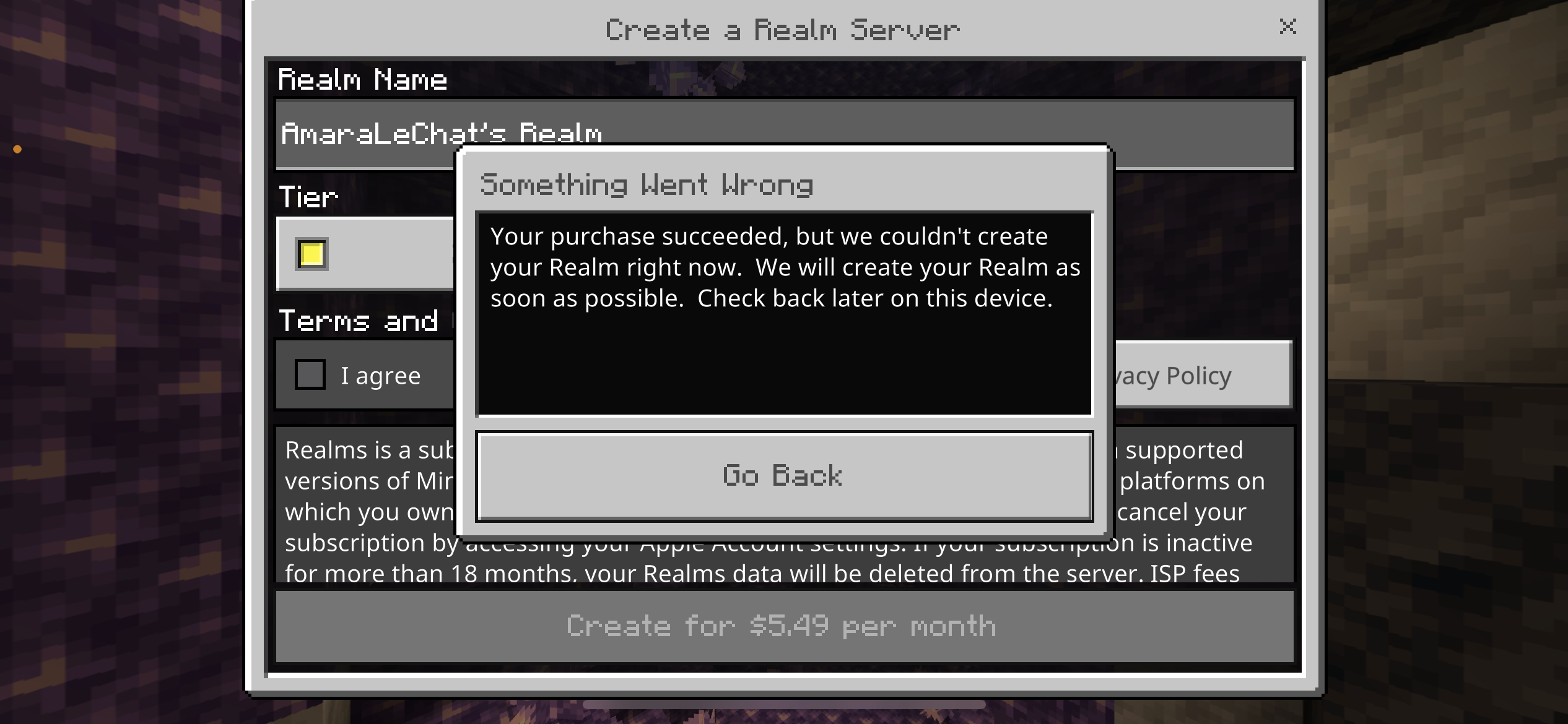 I created a new Minecraft realm, but it says my purchase was succeeded, but it couldn’t create my realm right now. They said they will create my realm as soon as possible!!!!!