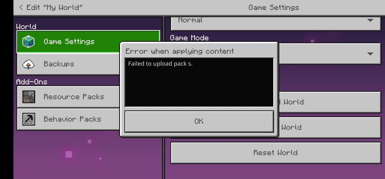 I want to play mod in realm but cant play because it error(Mod is want to open expirent mode)