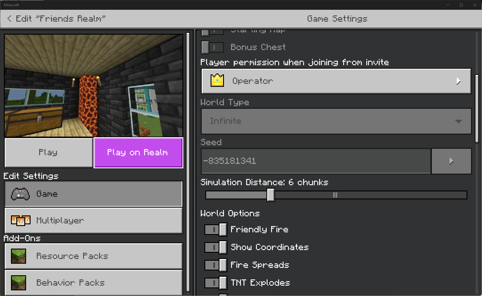 II. Attempt to click on "Play on Realm" created a 10 player Realm, the process completes and I get loaded to a completely new seeded world.