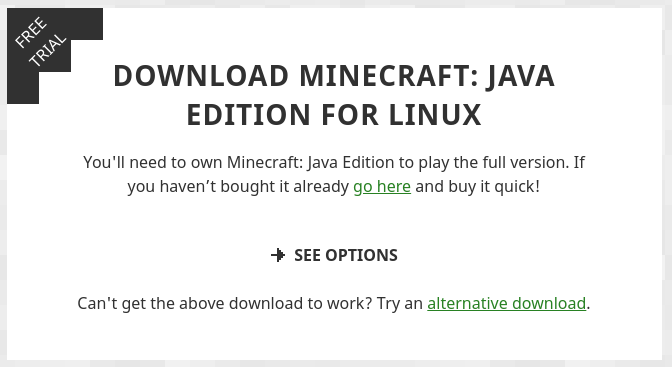 The link for the "-> See Options" button on https://www.minecraft.net/en-us/download/ has an extra %20 in the URL that causes the page to 404. There is a working link right below it in the text that says "Can't get the above download to work? Try an alternative download."