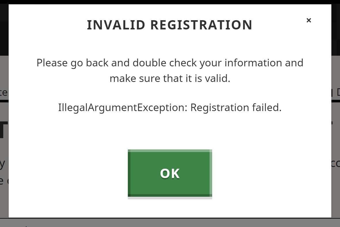 When I try to get a new minecraft account for my friend, it wouldnt let me because i run into the error code of IllegalArgumentException: Registration failed. Would anyone here know how to fix it? Thanks.