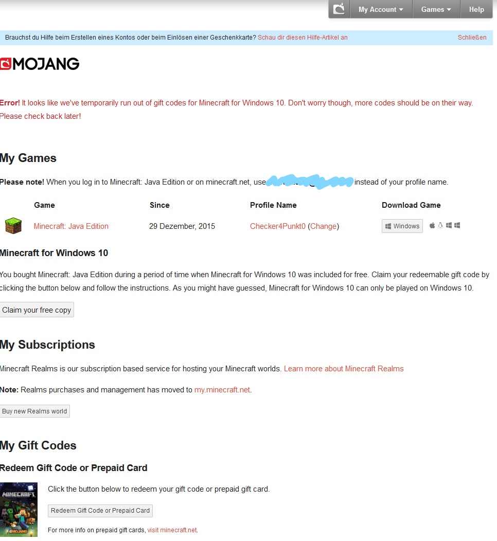 'Error! It looks like we've temporarily run out of gift codes for Minecraft for Windows 10. Don't worry though, more codes should be on their way. Please check back later!'