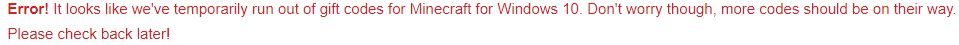When I try to redeem my free windows 10 copy it says ,,Error! It looks like we've temporarily run out of gift codes for Minecraft for Windows 10. Don't worry though, more codes should be on their way. Please check back later!" And that's been like two weeks already,I also have Minecraft Java Edition from 28th of March 2017,so if you can,please help me!!!