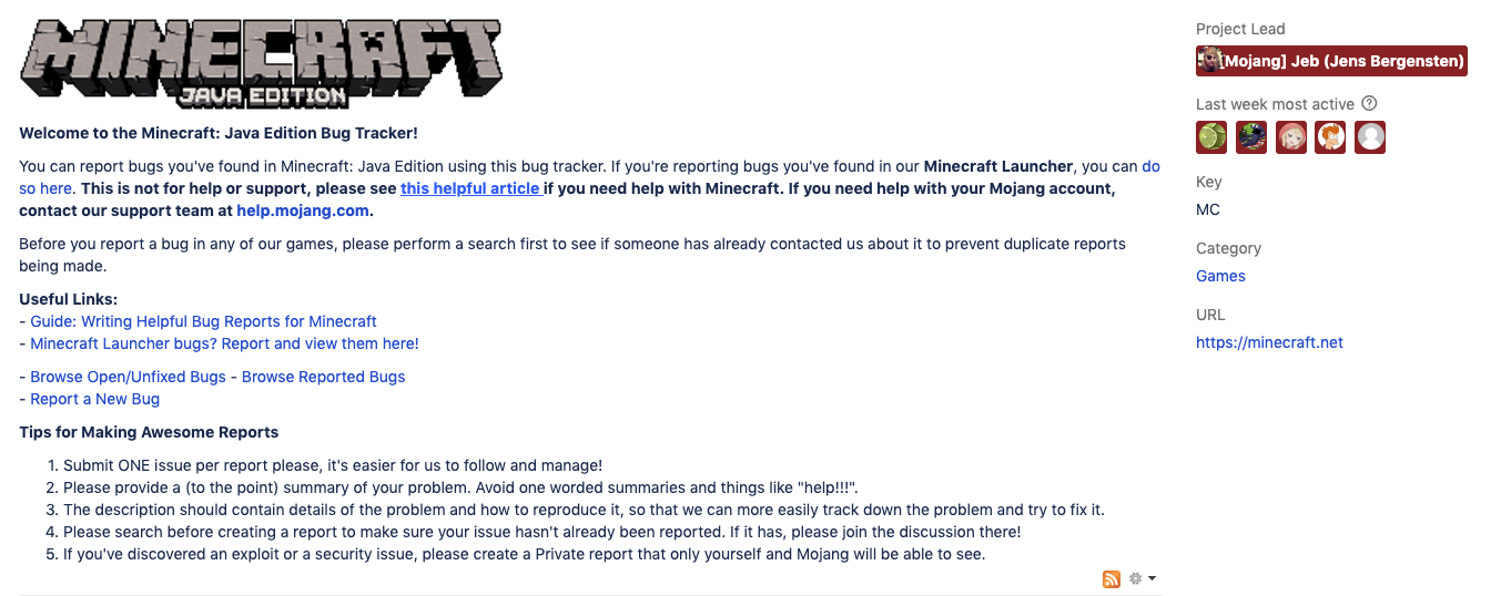 When selecting the Guide: Writing Helpful Bug Reports for Minecraft link from the Minecraft Jira Bug Tracker, it gave me the following error: