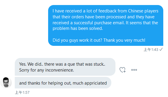We find that only Chinese payment methods, including Alipay and China UnionPay, have this issue; PayPal is not affected and works pretty well. Is this any kind of discrimination against the Chinese players? I wish the staff could fix it asap, or at least give us a human-written response that they are putting great effort on this. Sorry for these irrelevant words, but we are really concerning about not being able to get the game but just losing our money.