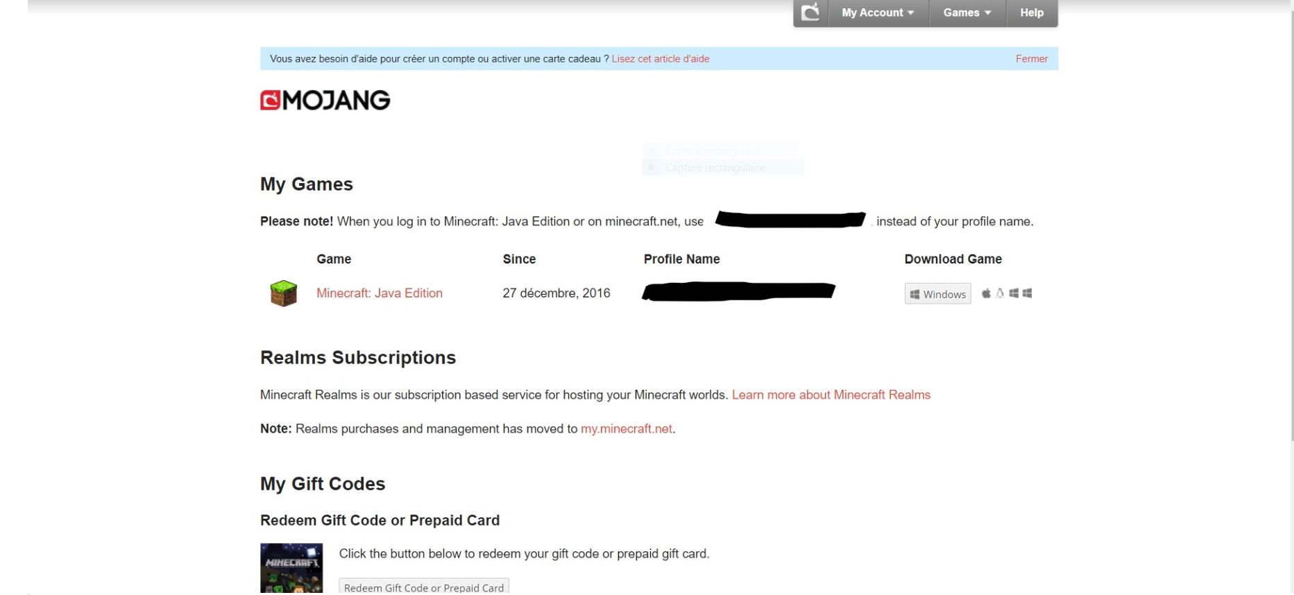 Indeed, I know exactly how I can get a code from my Mojang account (Java), because I don't want to re-buy Minecraft to use the Minecraft windows 10 edition, but on “my profile” -> “modify/delete” ->“account” -> “my account”, Minecraft win 10 isn't here. I know it should be here but it is not.