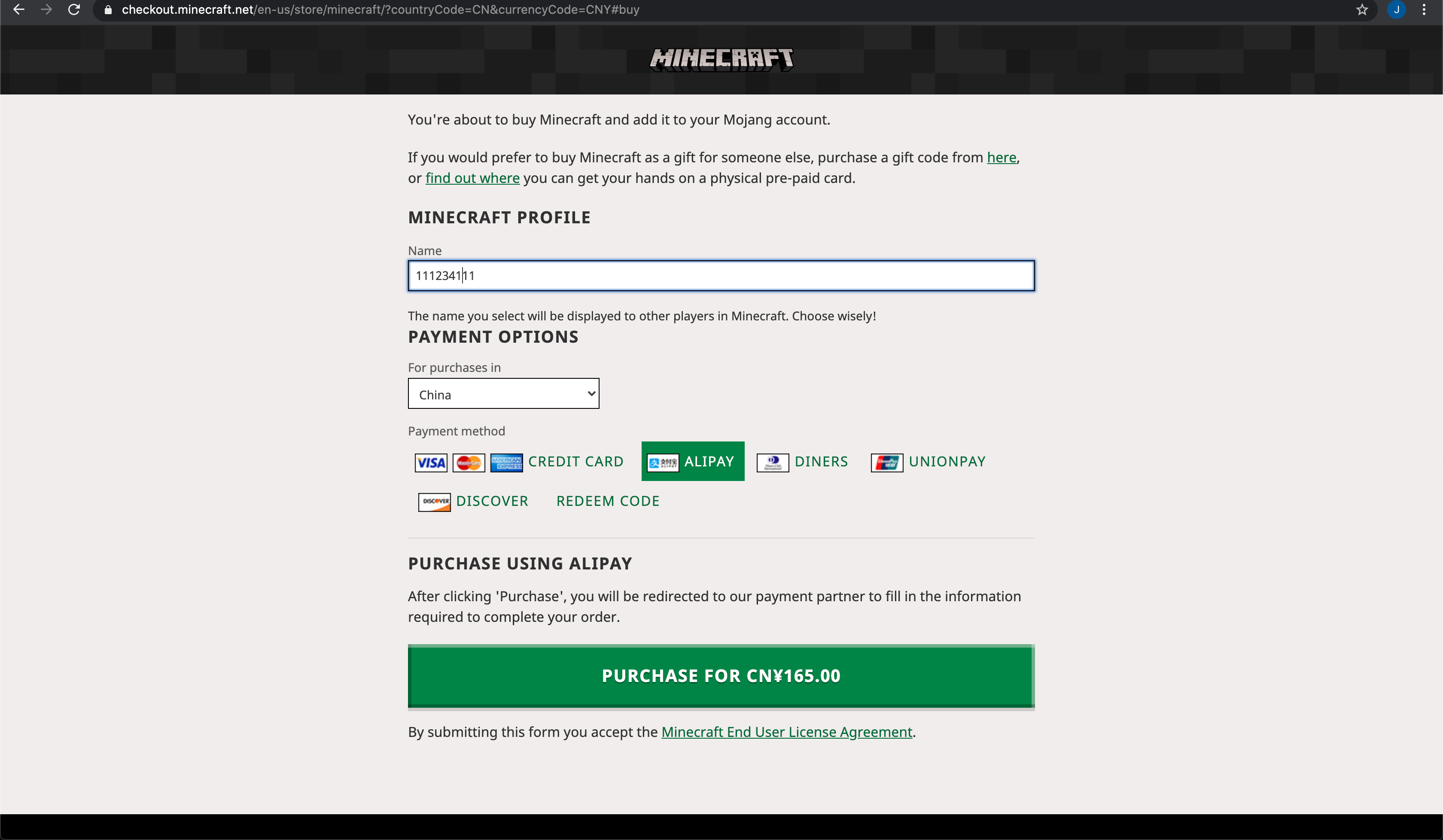 I am not able to purchase Minecraft using Alipay at the moment. After pressing the 'Purchase for 165RMB" button, it redirects us to 'adyen', however it says it could not process the request. After searching, it seems like the same problem did happen months ago for others. I will leave the link to that Issue. (https://bugs.mojang.com/browse/WEB-1985?jql=text%20~%20%22alipay%22)