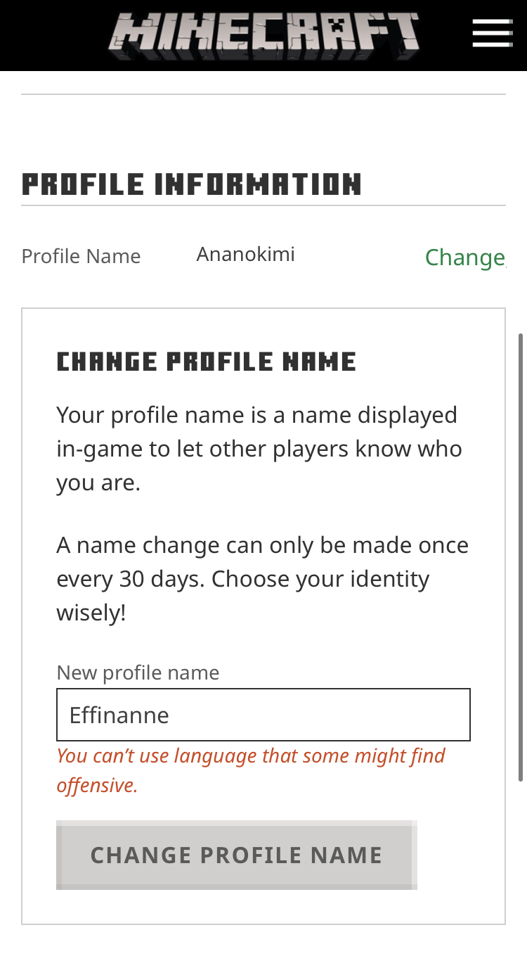 Whatever system filter is in place on the Mojang website to "filter" out inappropriate usernames is broken as the available username "Effinanne" which is the username currently used and not flagged here is being deemed as offensive. I believe the system filter may be bugged or not working. I am looking to make the username switch for safety reasons as my account name currently contains personal information and the filter being broken makes this change difficult. I want to reiterate that the username is available, contains no offensive, crude, discriminatory, or otherwise unfriendly language but it is still being flagged making the continued use of my account a safety hazard since it contains personal information.