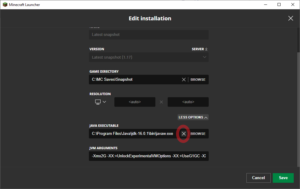 When I access the "More Options"section, there is no "X" button - instead there is a field for which Java Executable you should run.